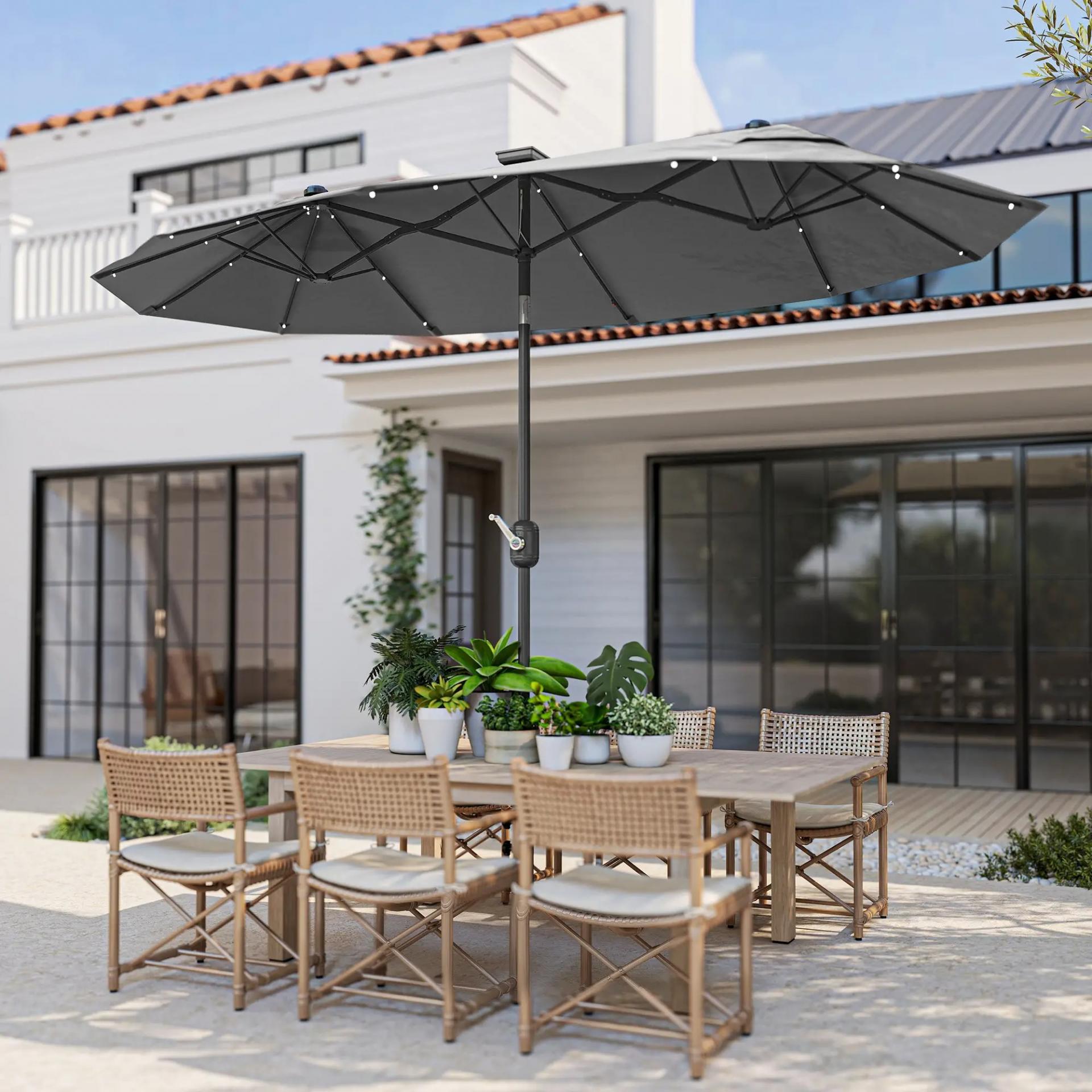 - SOMBRILLA DOBLE: Este elegante parasol para patio, de gran tamaño, te ofrecerá una gran área de sombra en cualquier espacio al aire libre, como el jardín o terraza de tu hogar. Es perfecta para sentarte cómodamente y disfrutar de tu tiempo al aire libre con amigos y familia