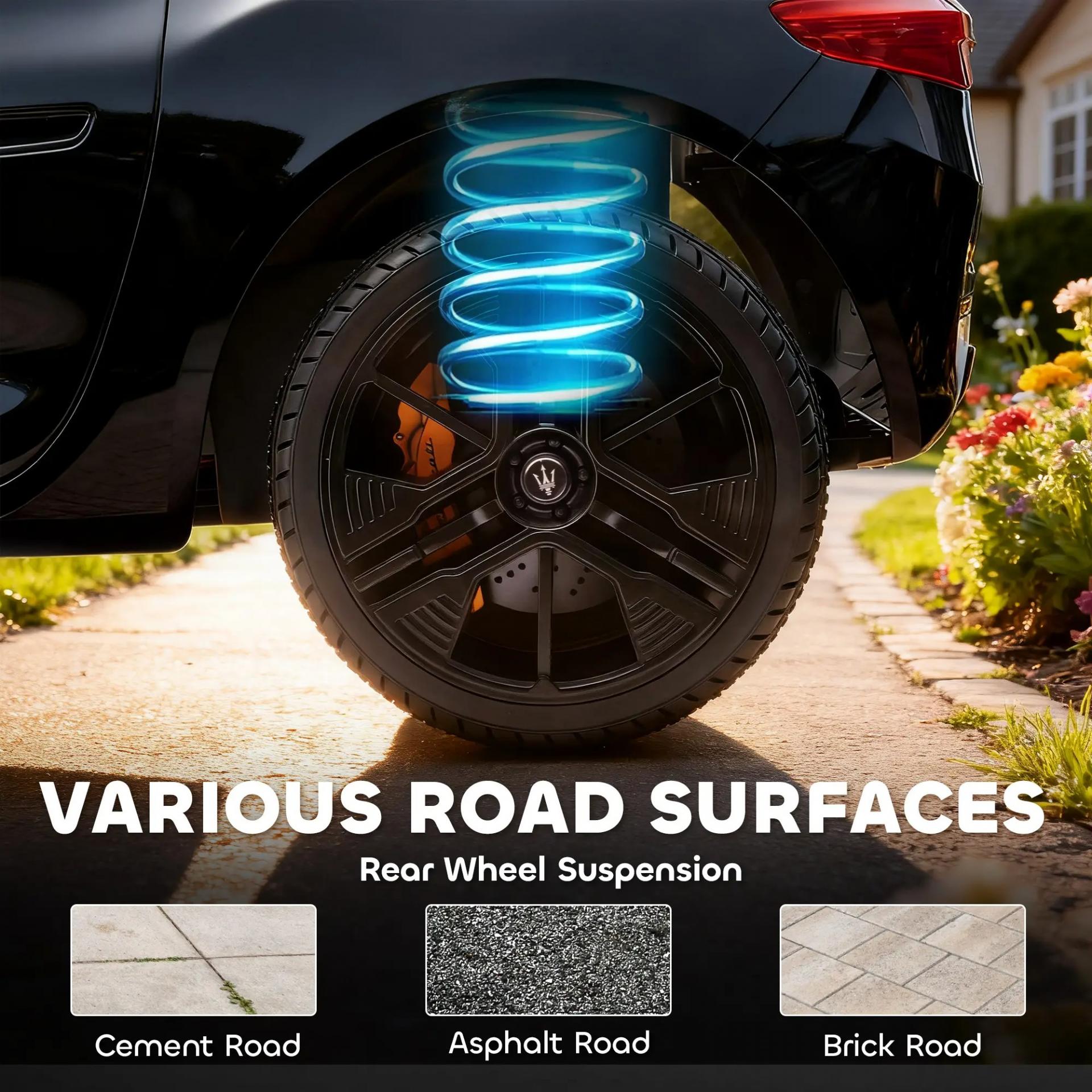 Licencia Maserati: Coche eléctrico infantil con licencia oficial de Maserati. Incluye reproductor MP3, puerto USB, música, luces LED y sonidos de motor para una experiencia de conducción única. Un regalo perfecto para los niños aventureros.
