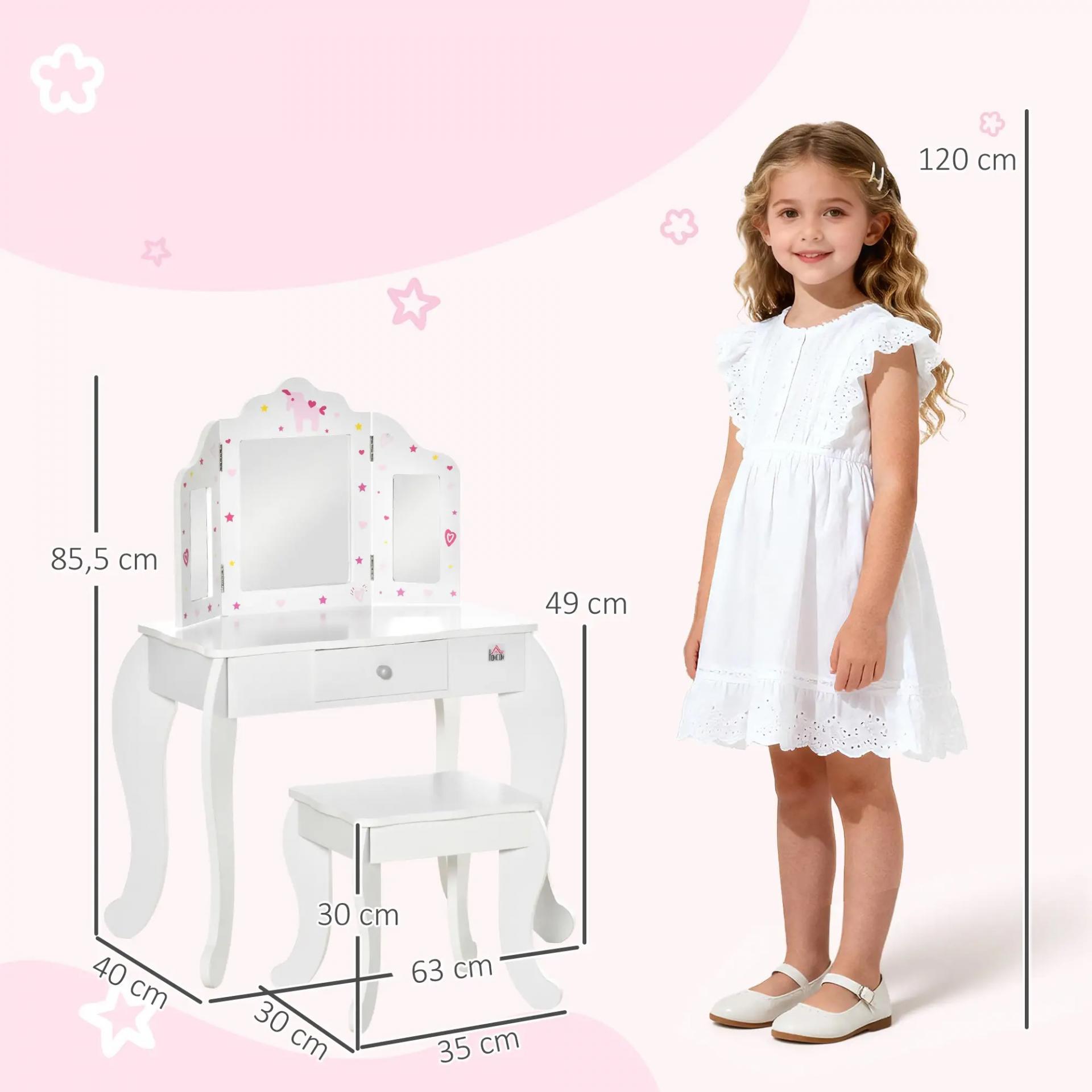 - MEDIDAS TOTALES: El tocador mide 63x40x85,5 cm y el taburete mide 35x30x30 cm. Altura libre bajo mesa: 39 cm. Apto para niños de 3-6 años. Carga máxima: 40 kg por pieza. Cumple con la normativa: EN71-1-2-3, EN17191, CE DOC, REACH DOC y otras. Requiere montaje