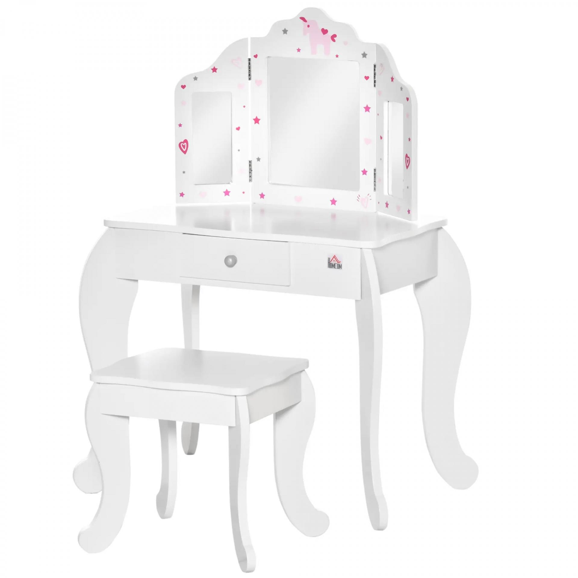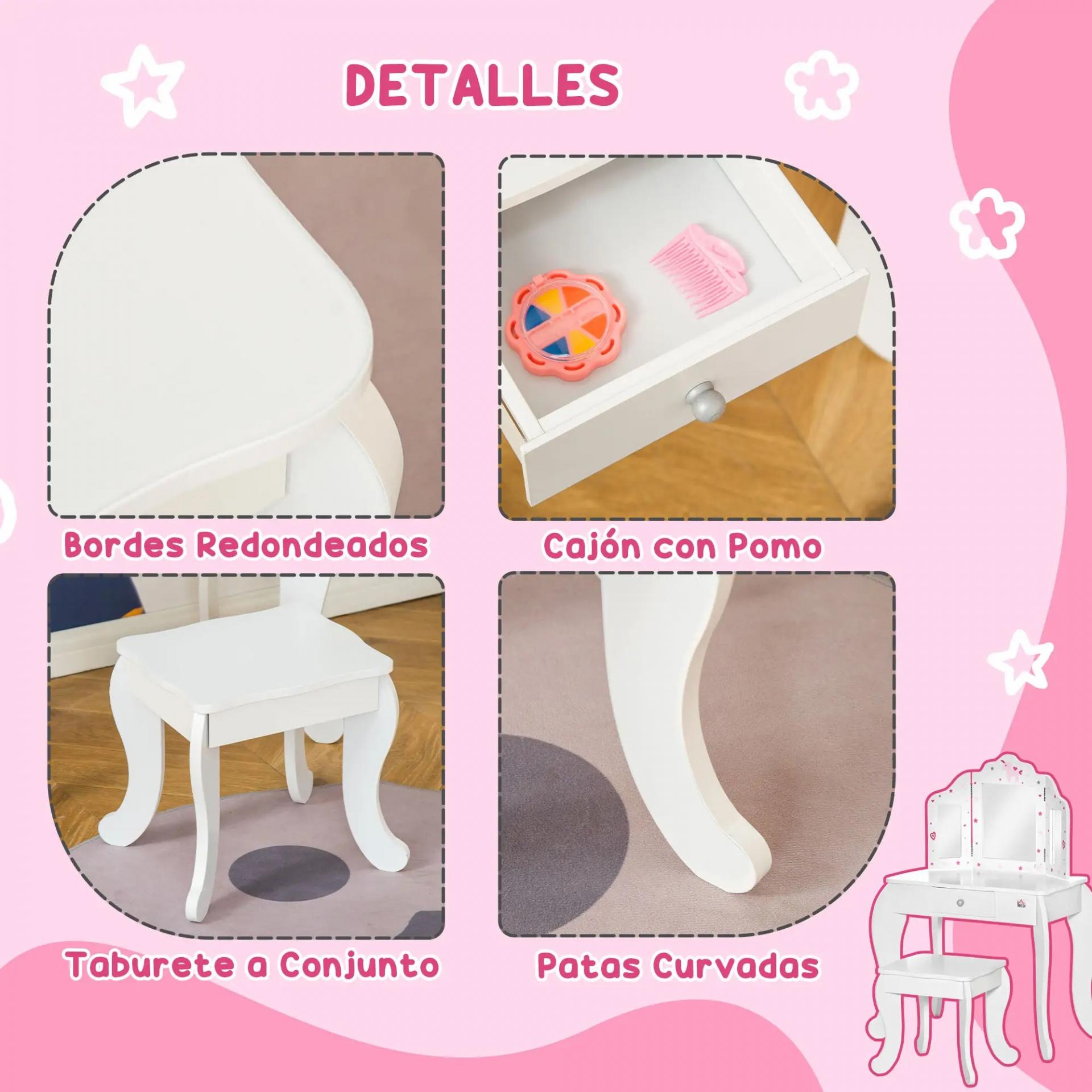TOCADOR INFANTIL DE MADERA BLANCO: Este encantador tocador para niños incluye espejo de tres paneles y taburete a juego. Ideal para dormitorio, zona de juegos o rincón creativo, con un diseño pensado especialmente para los más pequeños