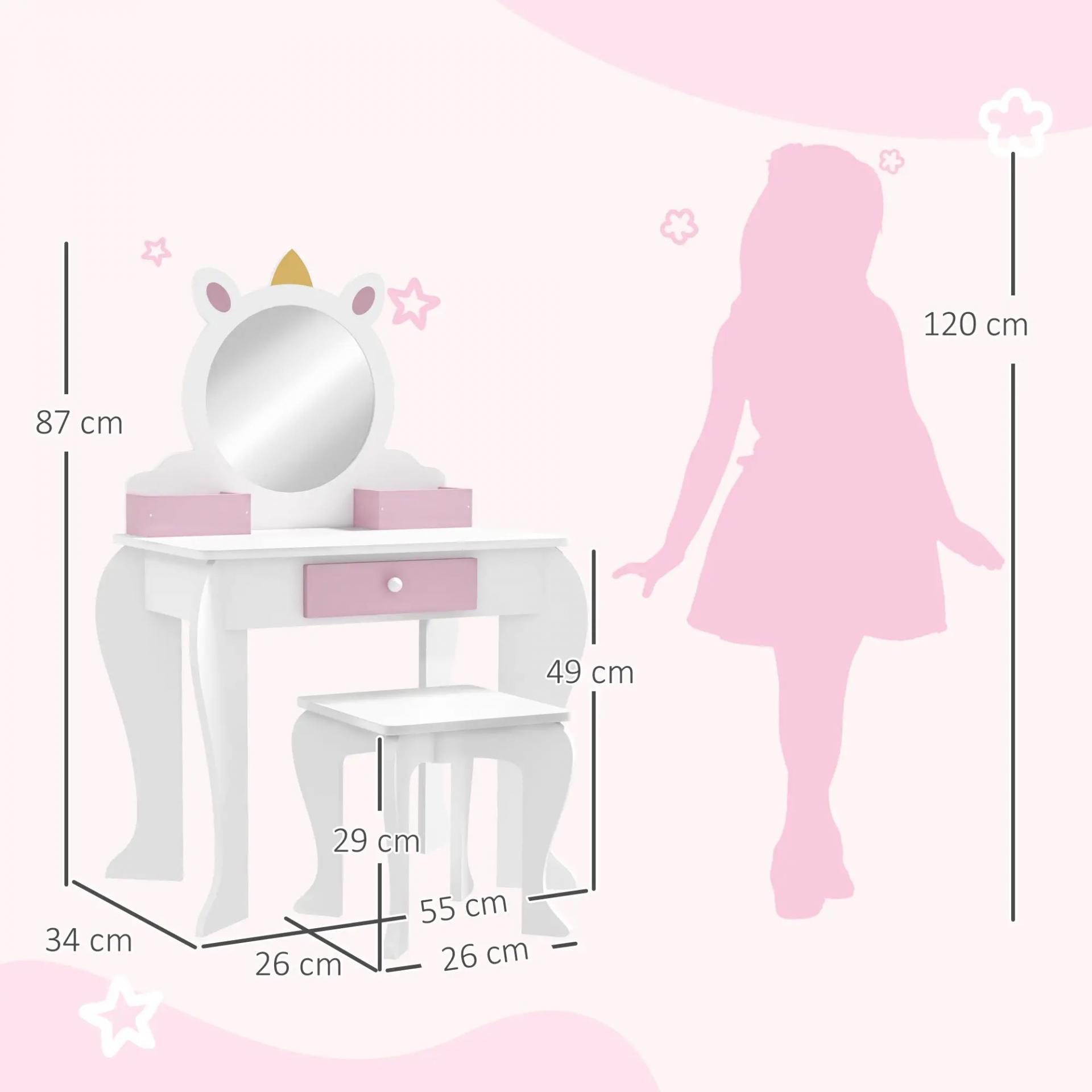 Tocador Infantil con Taburete y Espejo Tocador para Niñas con Cajón Compartimentos Diseño de Unicornio Blanco
