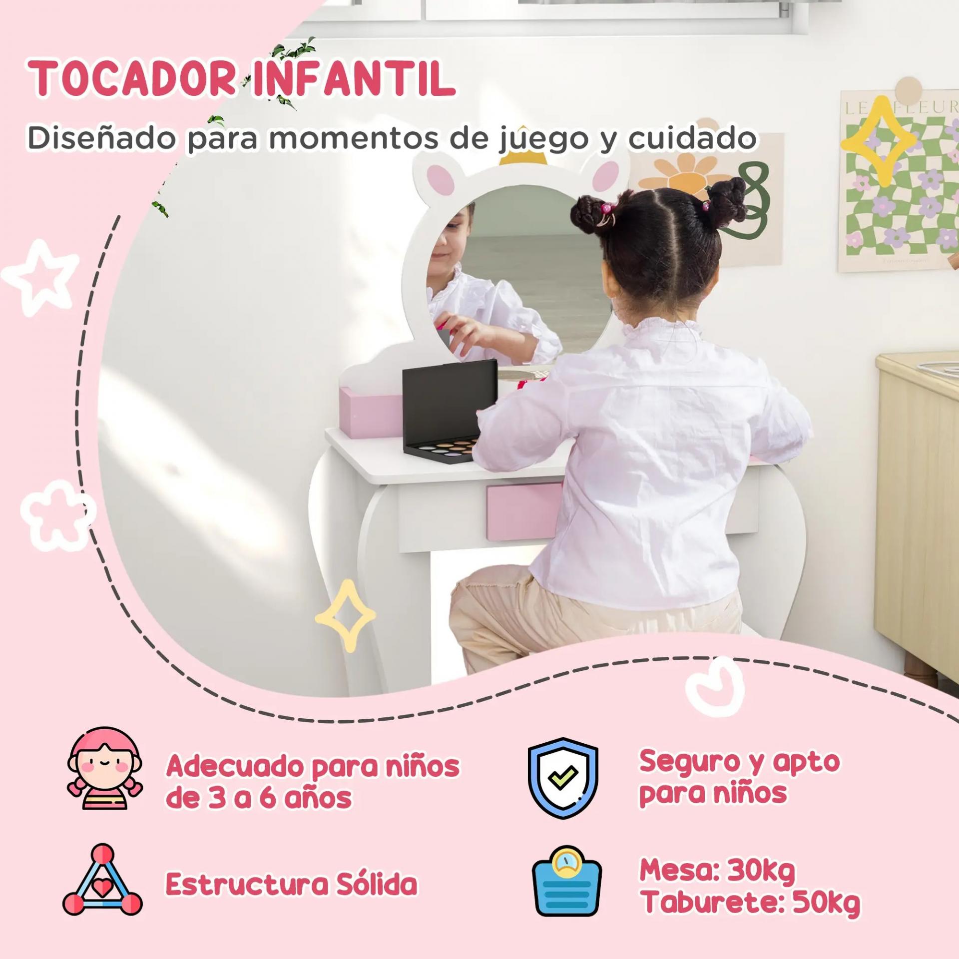 CONJUNTO DE 2 PIEZAS: Incluye un tocador infantil y un taburete a juego, perfectos para que tus peques se arreglen, jueguen o dibujen. Un set completo que combina diversión y organización en un solo espacio