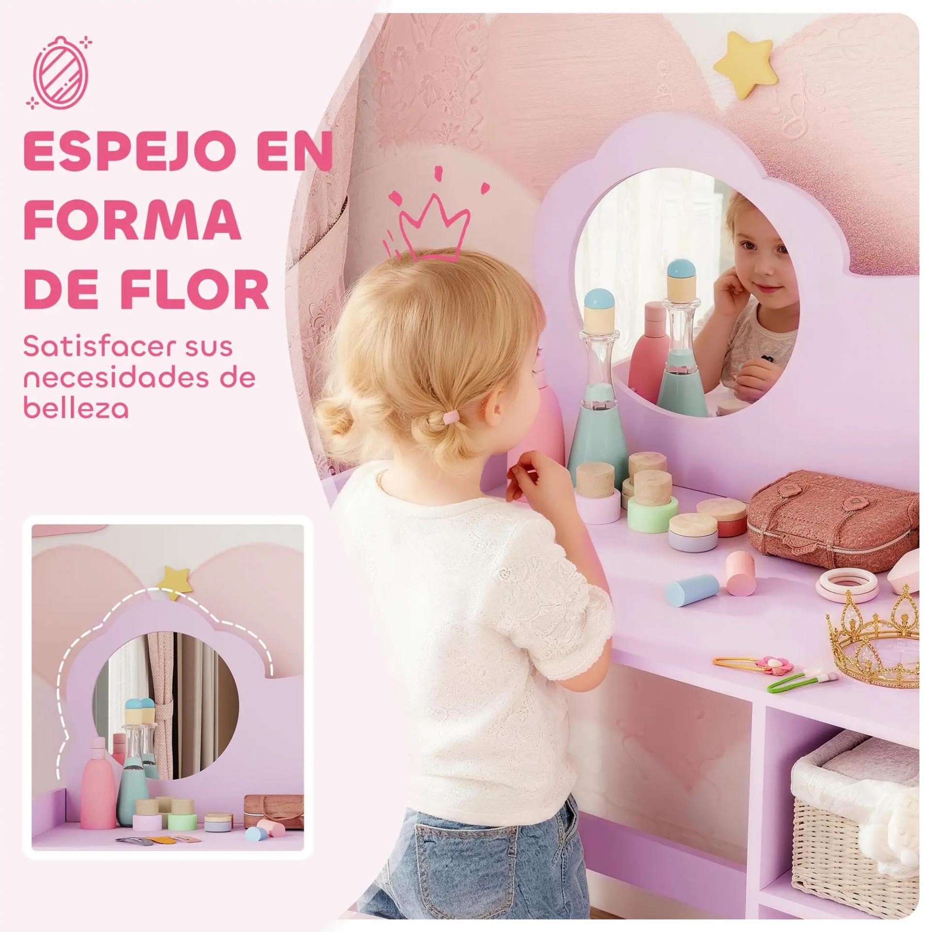 DISEÑO CON ESPEJO EN FLOR: Este tocador infantil incluye un espejo acrílico con marco en forma de flor y una amplia encimera, creando un rincón mágico para que los niños se diviertan peinándose, jugando al maquillaje o decorando su propio espacio