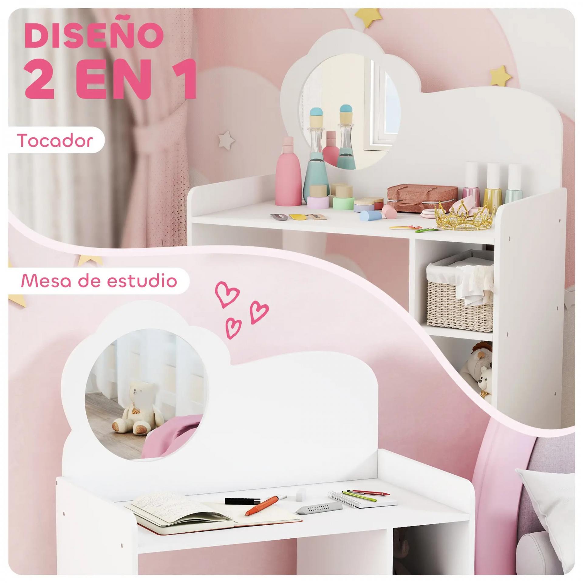 - DISEÑO 2 EN 1: Este tocador infantil cuenta con una amplia encimera que ofrece espacio para juegos de maquillaje y disfraces, y que además se transforma en un práctico escritorio para que los niños puedan dibujar, leer o hacer los deberes con comodidad