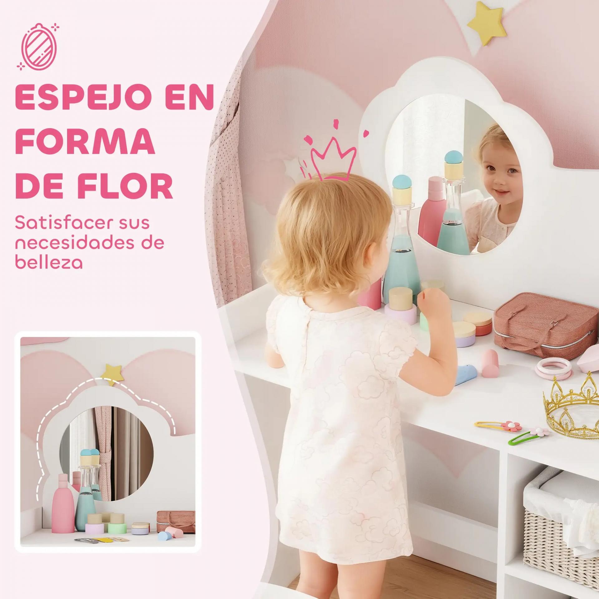 DISEÑO CON ESPEJO EN FLOR: Este tocador infantil incluye un espejo acrílico con marco en forma de flor y una amplia encimera, creando un rincón mágico para que los niños se diviertan peinándose, jugando al maquillaje o decorando su propio espacio