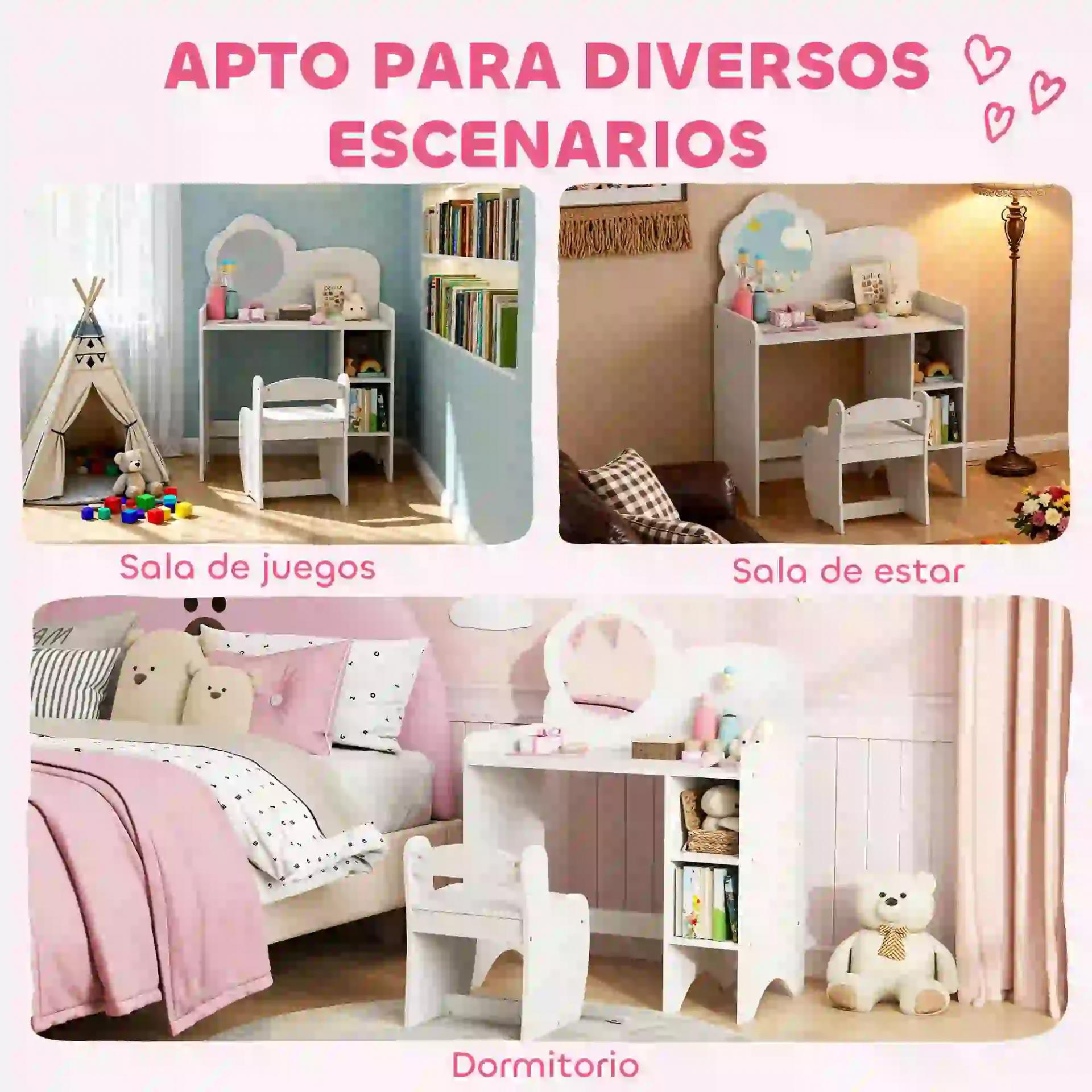 - REGALO IDEAL: Este conjunto de tocador infantil con silla es perfecto como regalo de cumpleaños, navidades o fiestas. Ofrece a los niños a partir de 3 años un espacio propio y especial donde jugar, imaginar y fomentar su autonomía con alegría