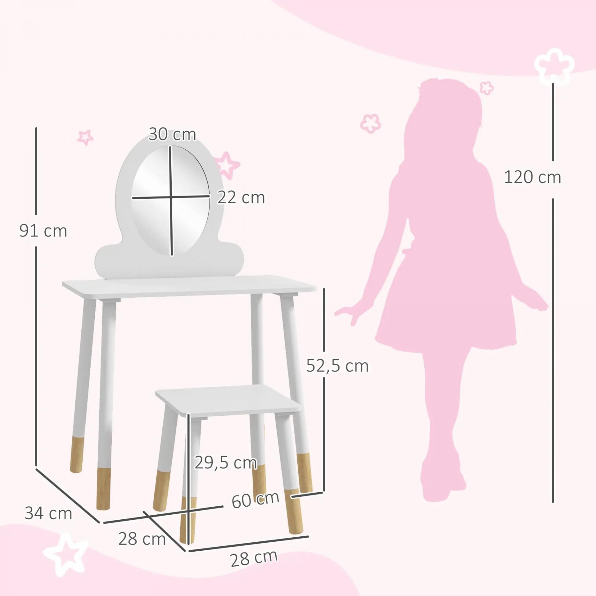 - MEDIDAS TOTALES: El tocador mide 60x34x91 cm (LxANxAL) y el taburete mide 28x28x29,5 cm (LxANxAL). Peso máximo soportado: 25 kg. Edad recomendada: a partir de 3 años. Cumple con: EN71-1-2-3, EN17191. Requiere montaje
