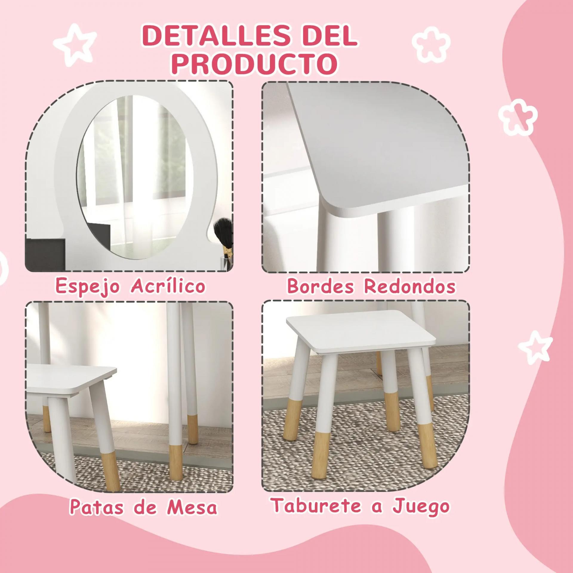 Tocador de Maquillaje para Niñas de +3 Años Tocador Infantil con Taburete y Espejo Diseño Sencillo Blanco
