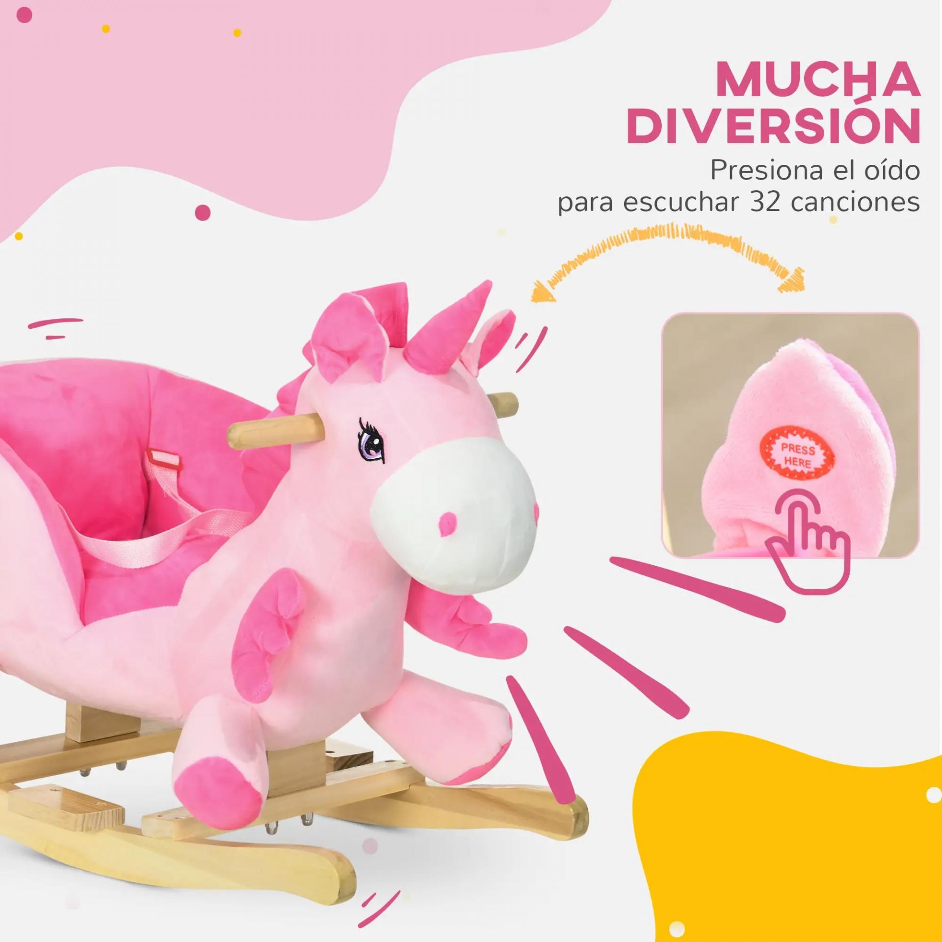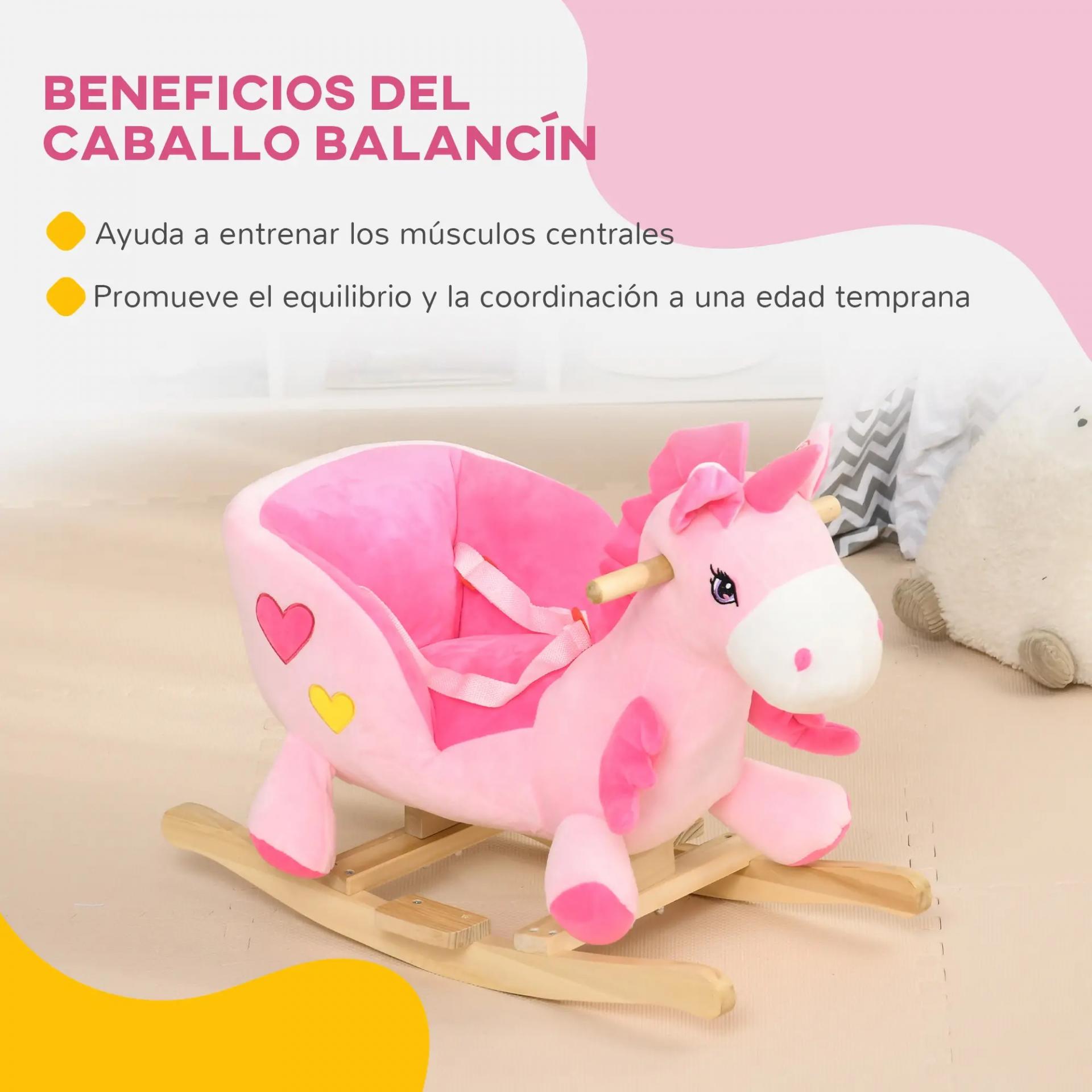 Caballito Balancín Infantil en Forma de Unicornio con Música Cinturón de Seguridad Manillar y Reposapiés 65x35x45cm Rosa