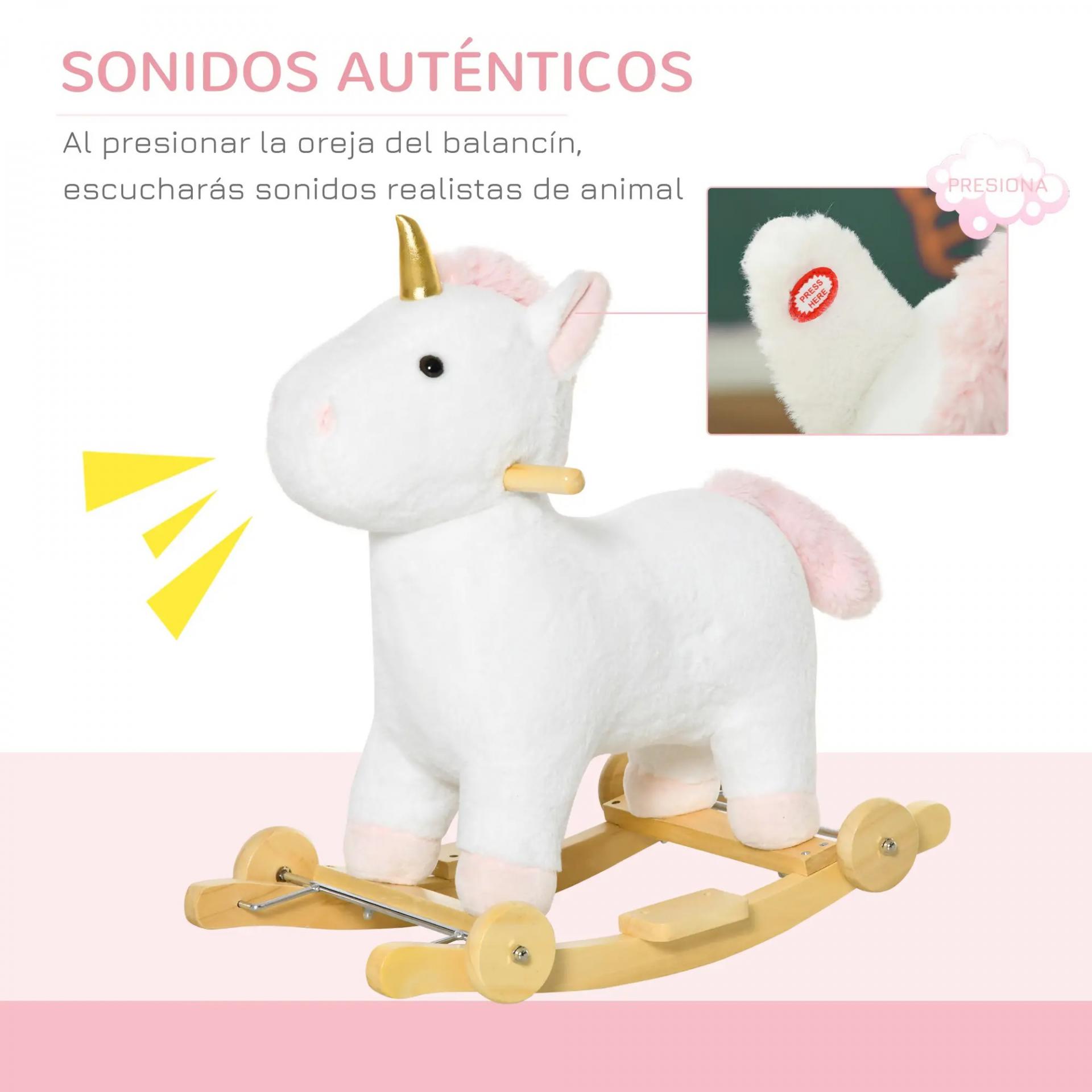Caballito Balancín Infantil en Forma de Unicornio para Niños de +3 Años Balancín de Felpa 2 en 1 con Ruedas y Sonidos 63x38x63 cm Blanco