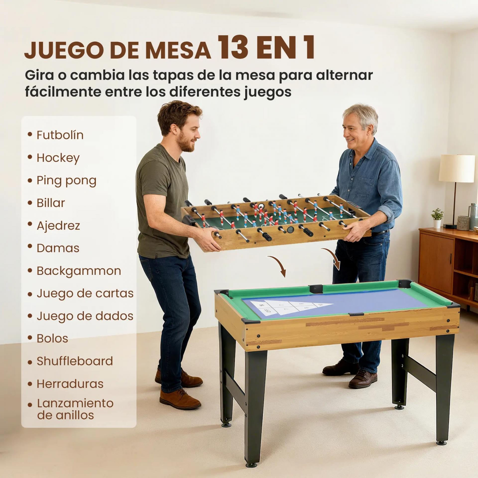 MESA DE JUEGOS 13 EN 1: Con esta mesa multijuegos disfrutas de 13 juegos en un solo mueble, desde futbolín hasta ajedrez. Sus superficies fáciles de cambiar evitan tener varias mesas y la hacen ideal para la diversión en familia