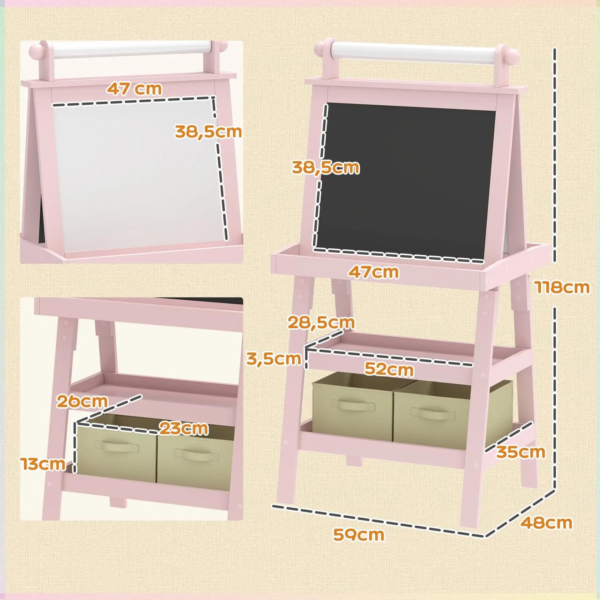 Pizarra Infantil Caballete 3 en 1 Caballete de Pintura para Niños de Doble Cara con Rollo de Papel y Cestas Rosa Palo