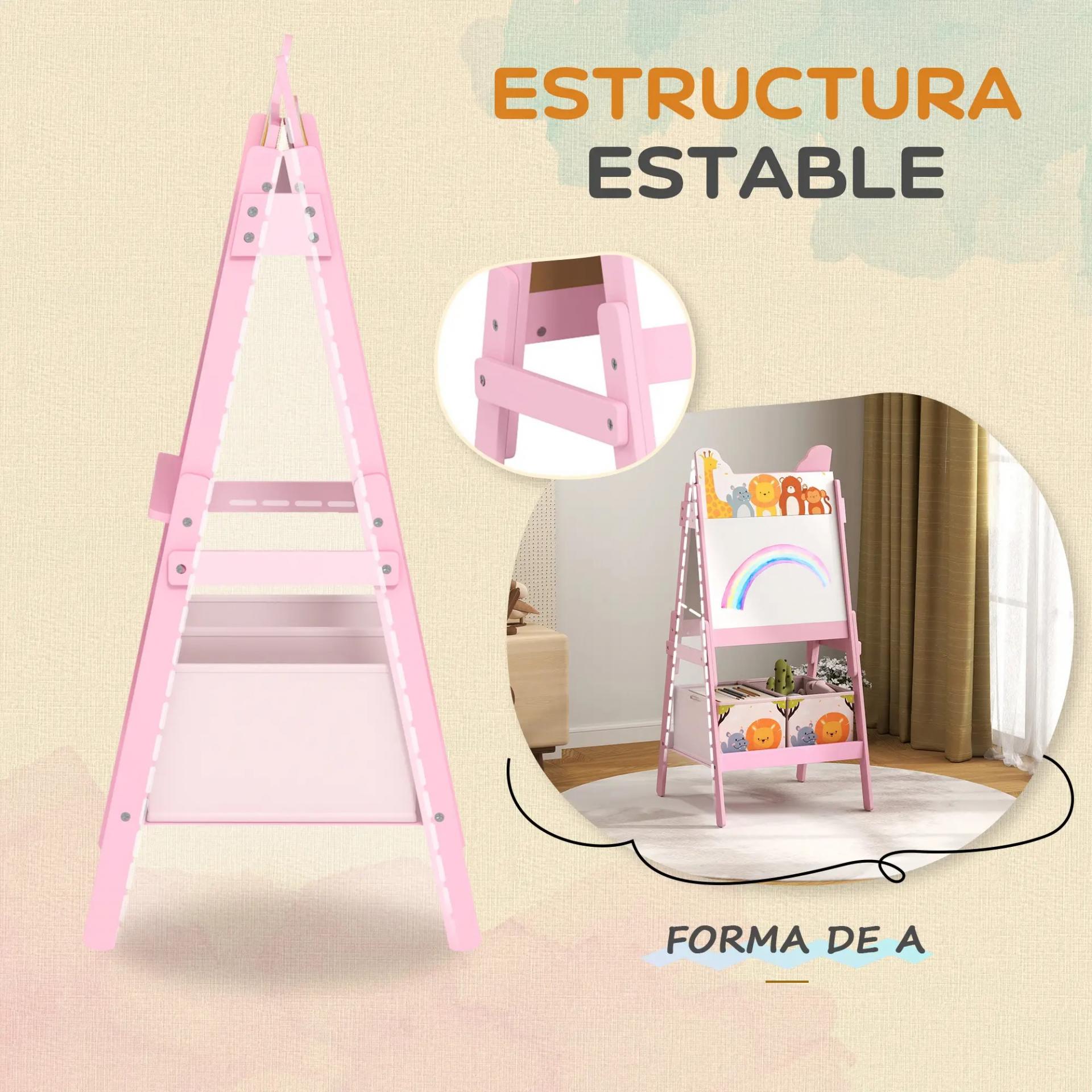 Pizarra Infantil de Doble Cara con 2 Cajas de Tela Caballete de Pintura para Niños con Estampado de Animales Rosa