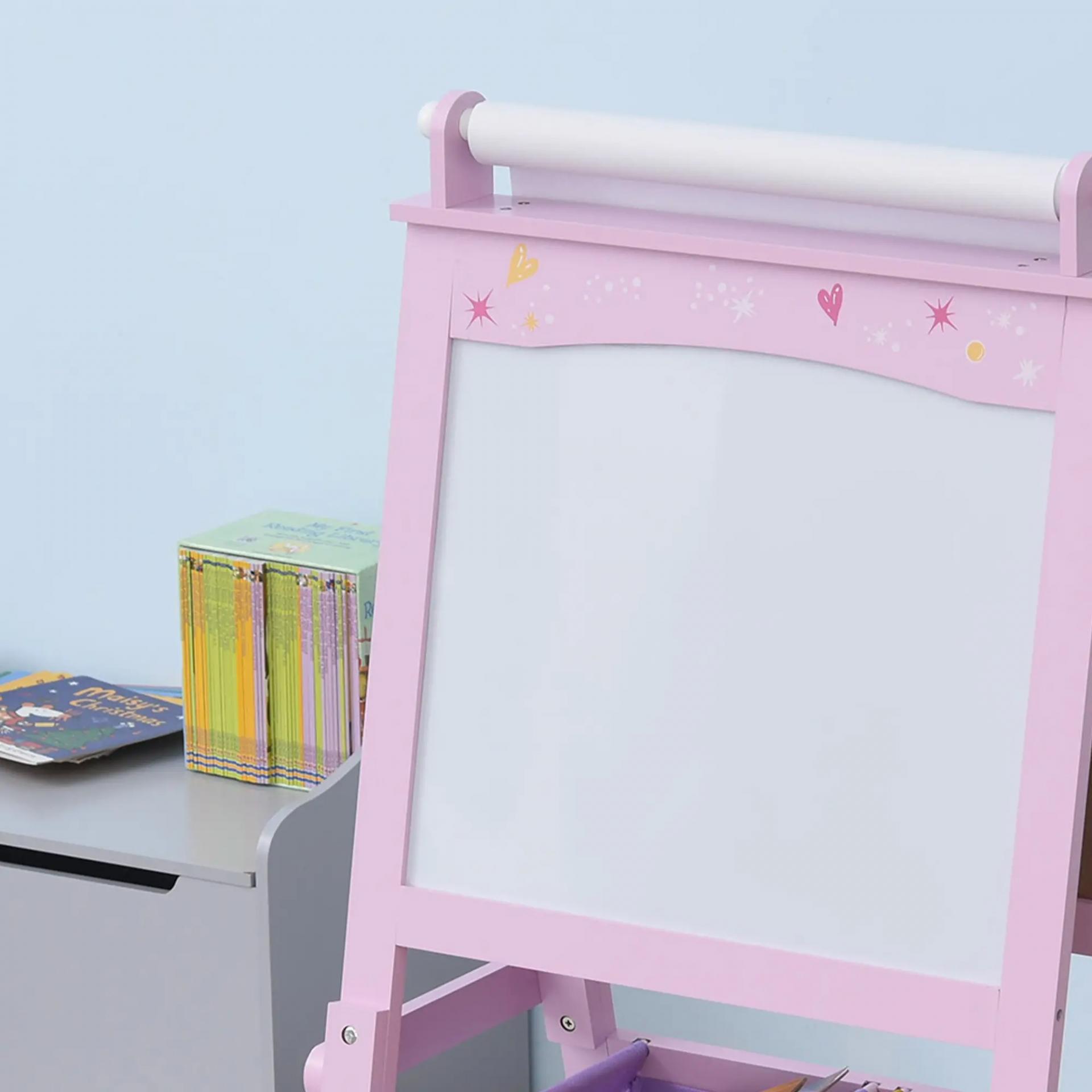 Pizarra de Doble Cara Caballete para Niños con Rollo de Papel y 2 Cestas de Almacenamiento 58,5x50,5x118 cm Rosa