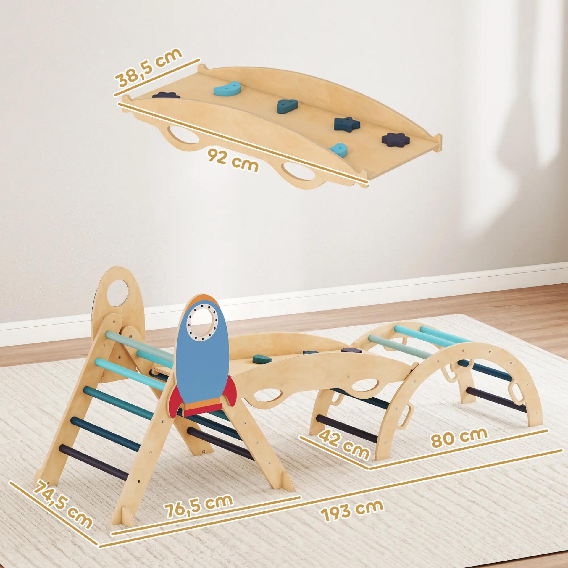SET DE ESCALADA INFANTIL: Este conjunto con diseño de cohetes incluye triángulo de escalada con pies de apoyo lateral, tabla 3 en 1 que se convierte en tobogán o balancín y arco de escalada que funciona también como mecedora. Un juego de motricidad ideal para casa
