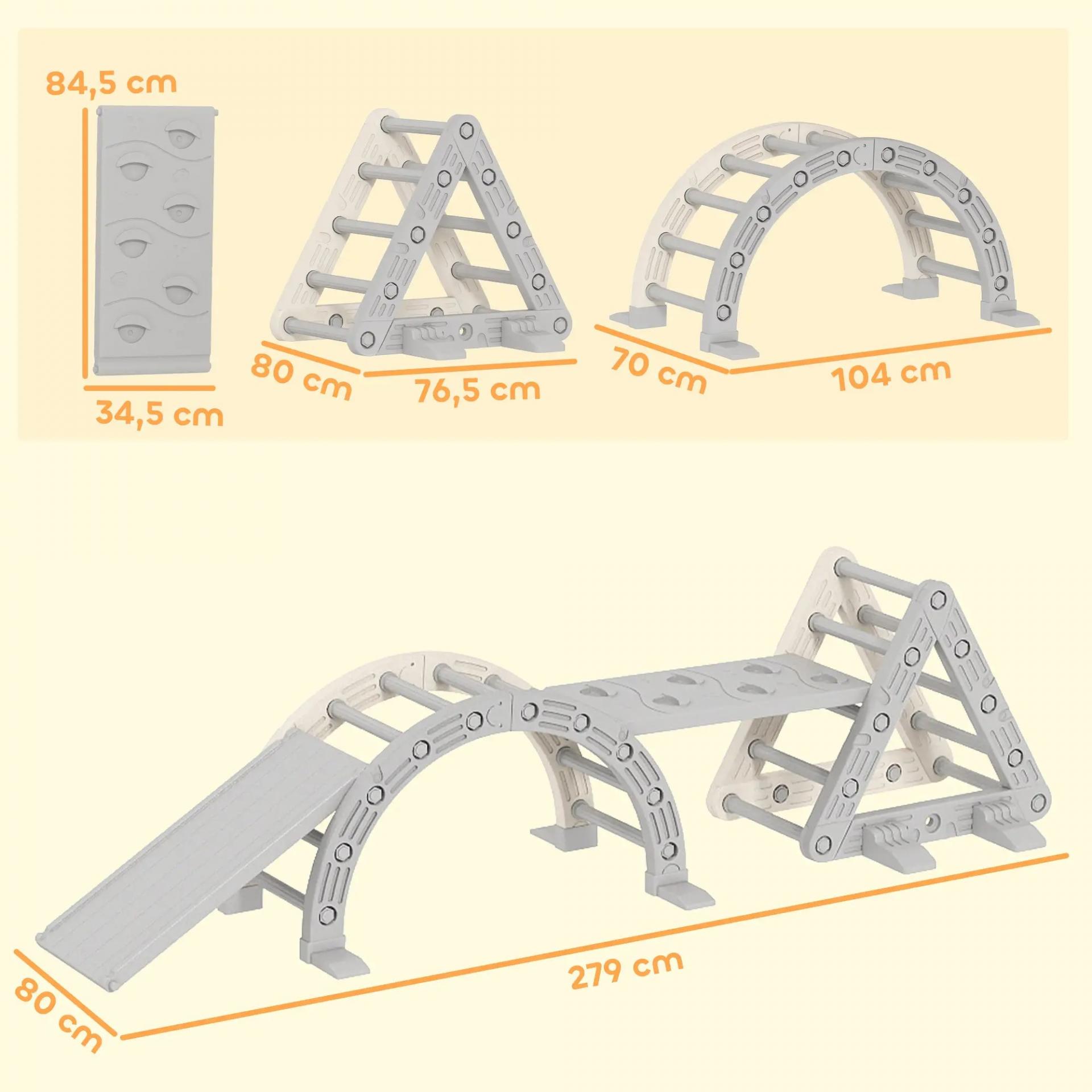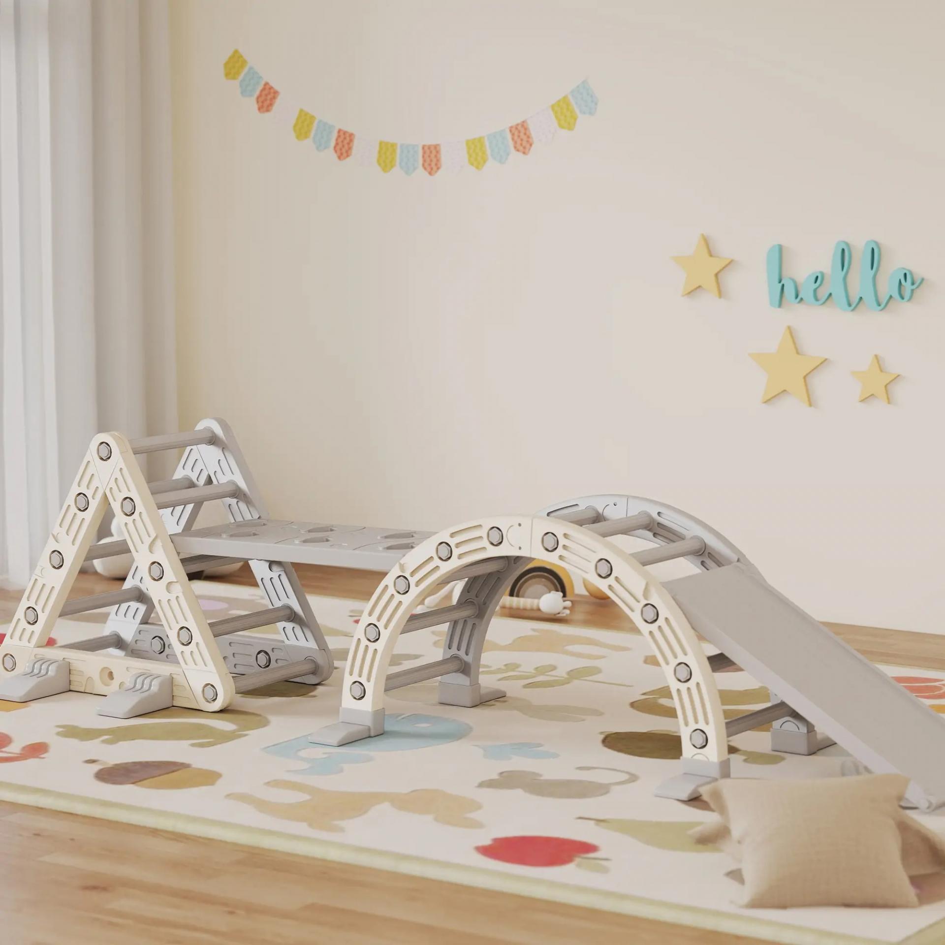 Estructura de escalada de interior, 5 en 1 Escalada con Tobogán, Arco de Escalada, Plataforma de Doble Cara, Parque Infantil Indoor para Niños de 18-48 Meses, Gris+Blanco
