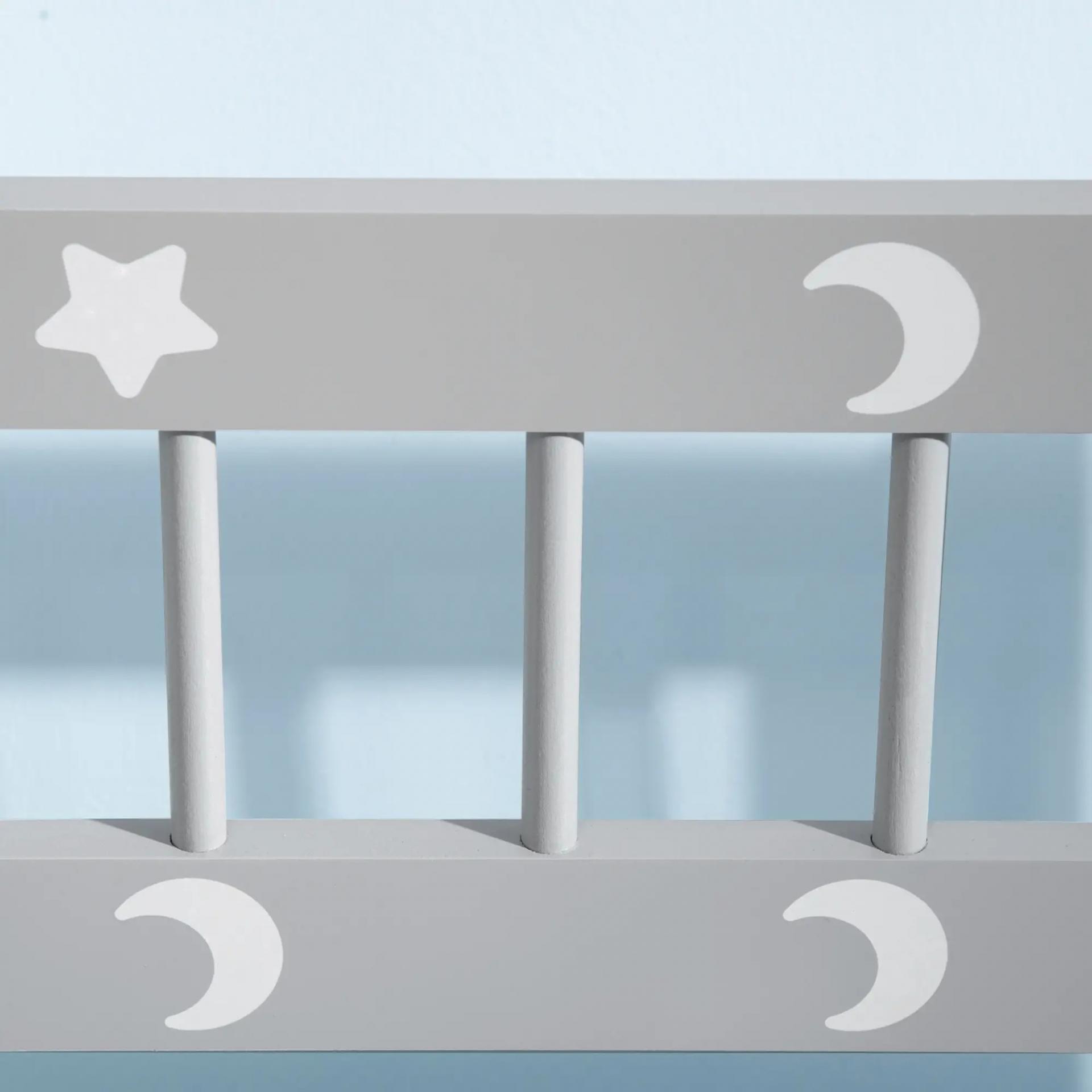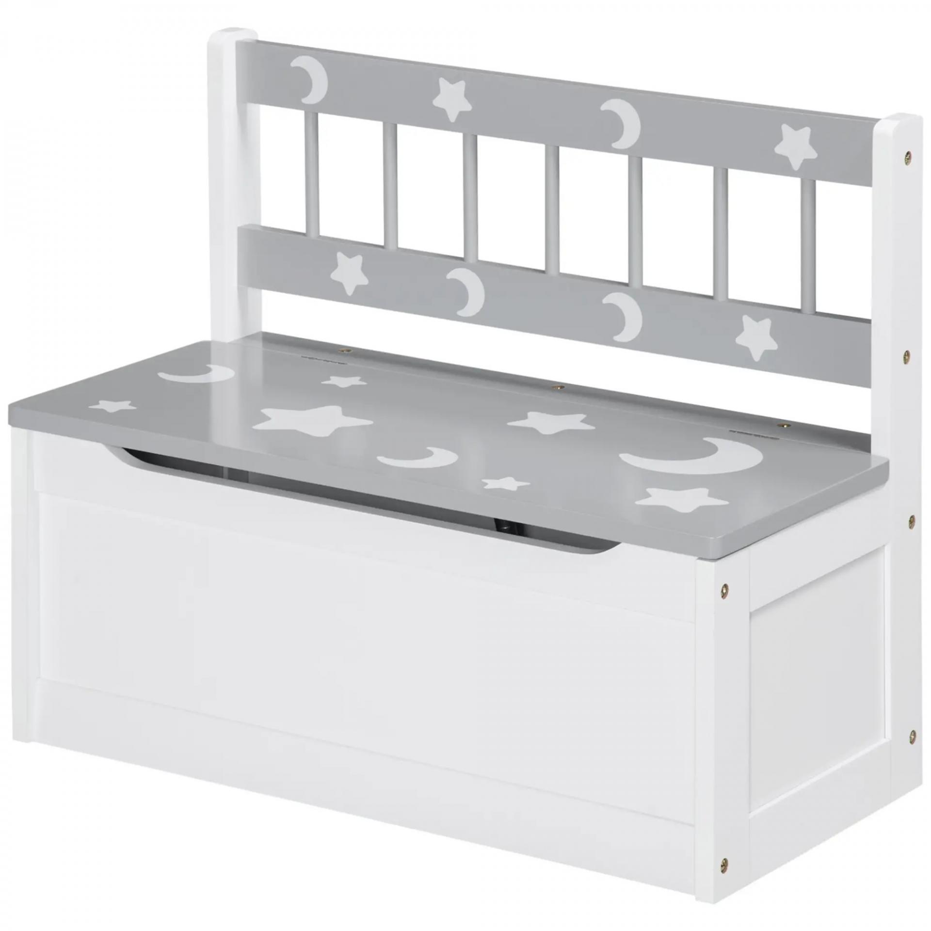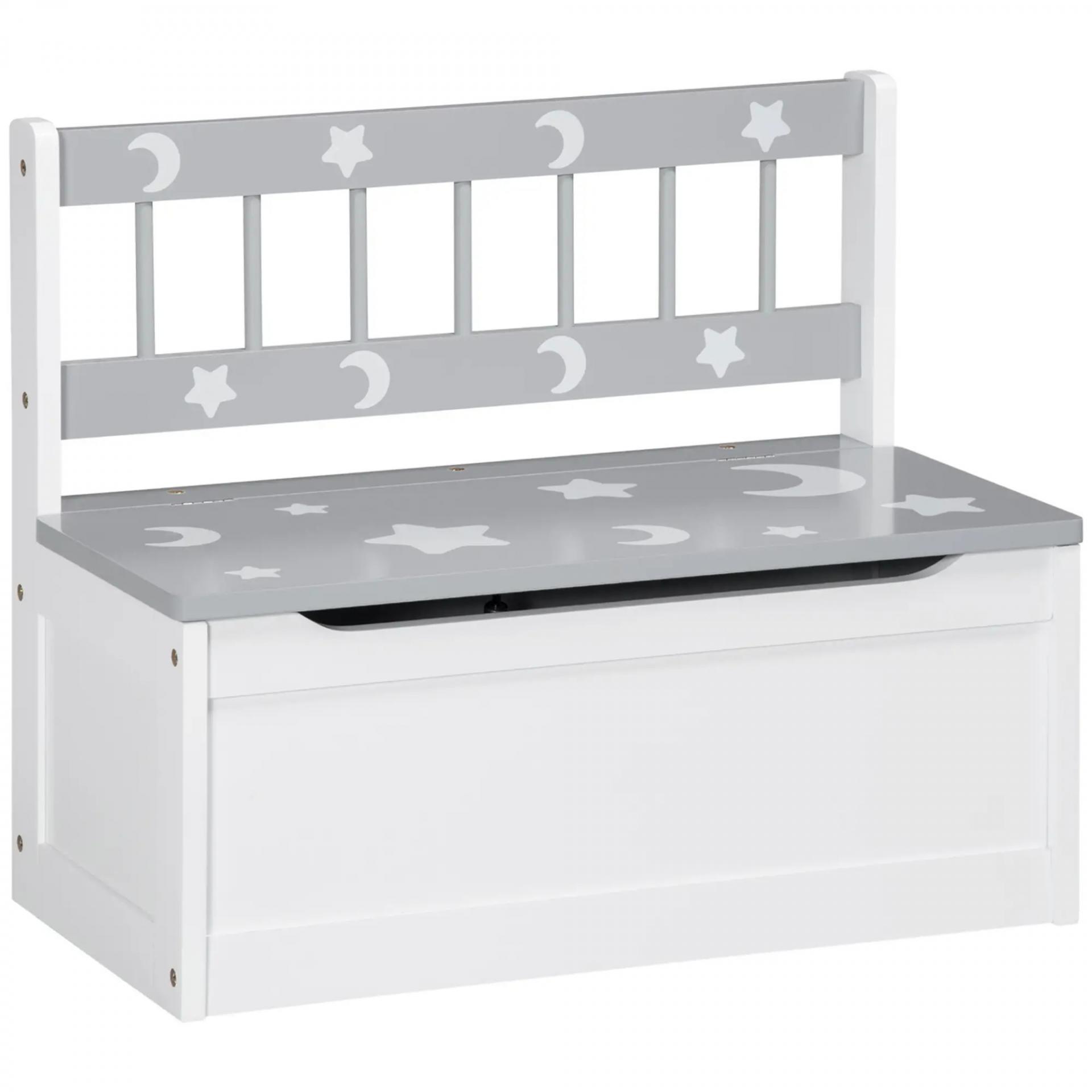 - RESISTENTE Y FUNCIONAL: Fabricado con tablero de MDF y madera de pino, este banco de almacenaje es la solución ideal para mantener cualquier habitación infantil o sola de juegos ordenada. Su bonito diseño en color blanco y gris con estampado de lunas y estrellas dará un toque decorativo y refinado allá donde lo coloques