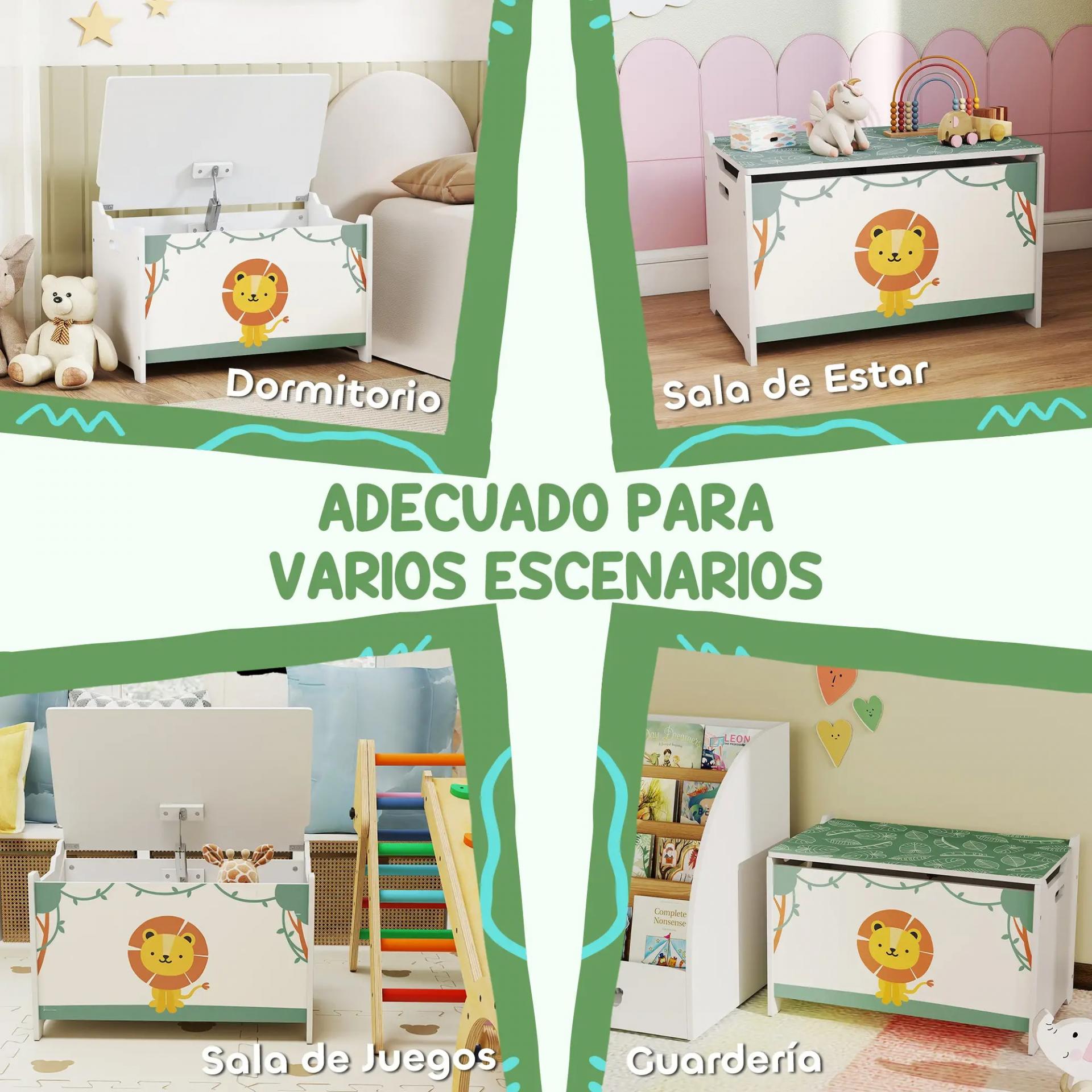 - DISEÑO ALEGRE Y DECORATIVO: Con ilustración de león sobre fondo verde con hojas, esta caja de juguetes se convierte en un elemento decorativo divertido, ideal para habitaciones infantiles, salas de juegos o guarderías