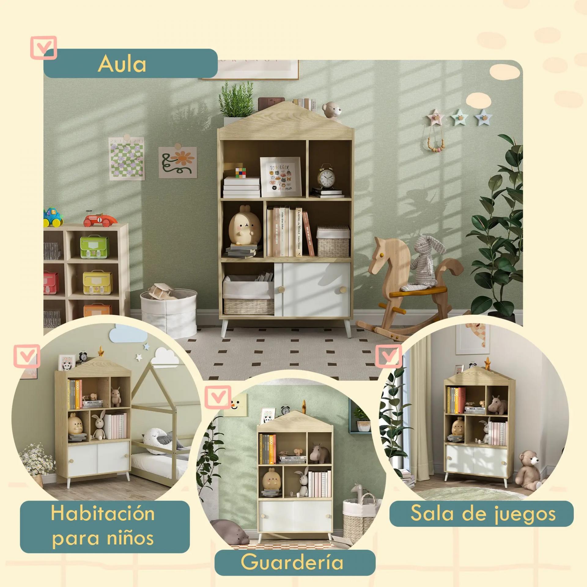 Librería Infantil con 4 Compartimentos Estantes Abiertos y Armario 80x30x140,5 cm Blanco y Natural