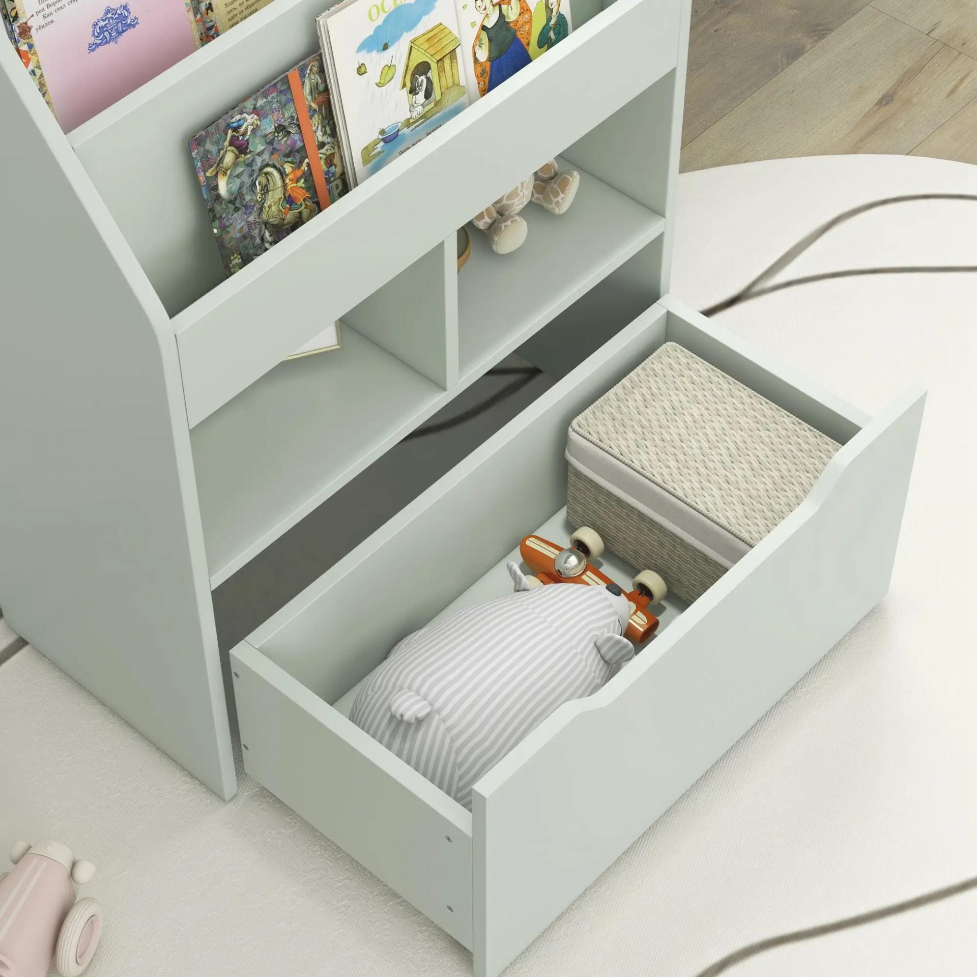 Estantería Infantil de Madera con 3 Compartimentos 2 Cubos y Cajón Móvil con 4 Ruedas 60x29,9x90 cm Verde