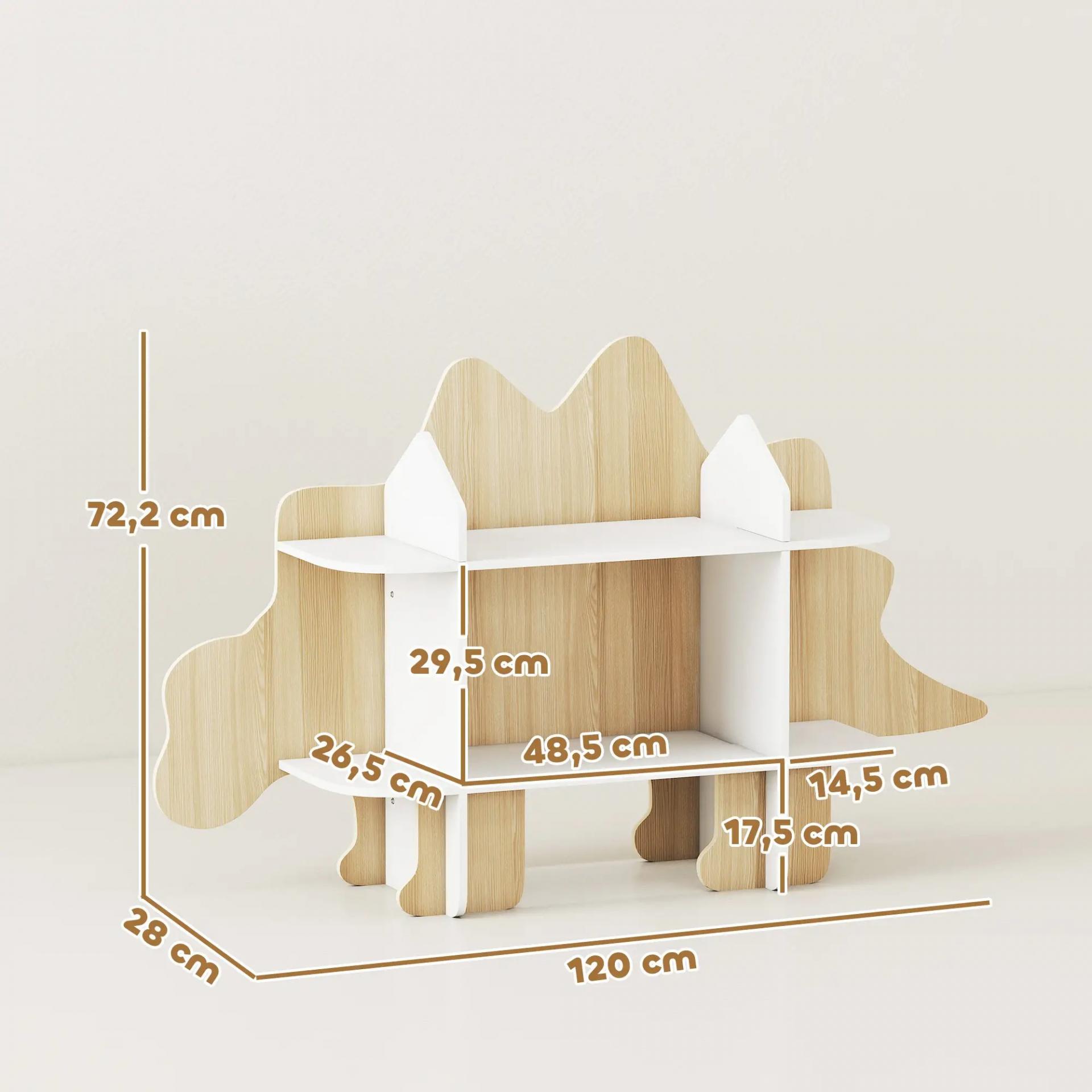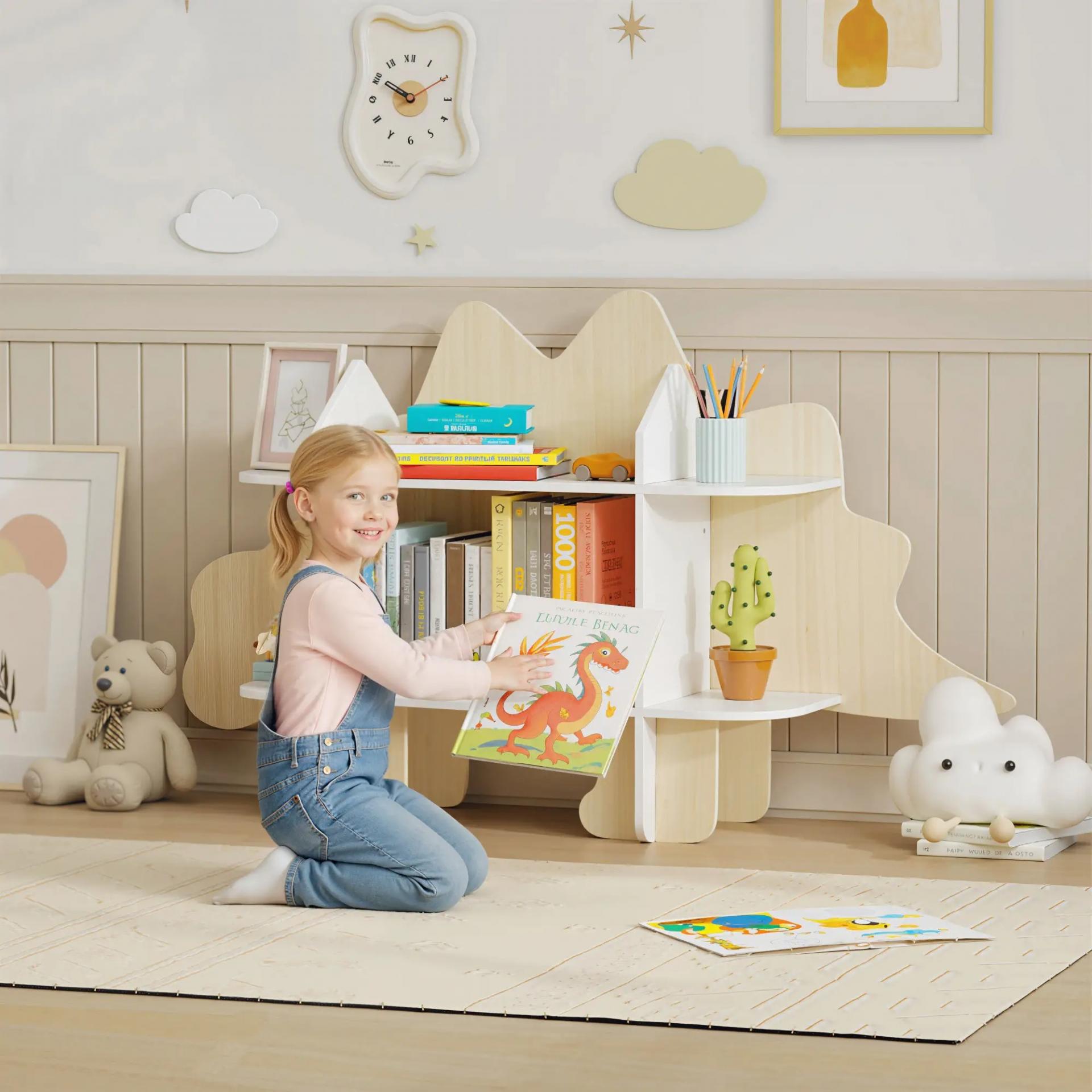 - DISEÑO DINOSAURIO: Con su atractivo diseño en forma de estegosaurio y su acabado en madera natural, esta biblioteca transforma el orden y los momentos de lectura en una experiencia placentera y diaria, perfecta para el salón, la habitación del bebé, la sala de juegos y el dormitorio