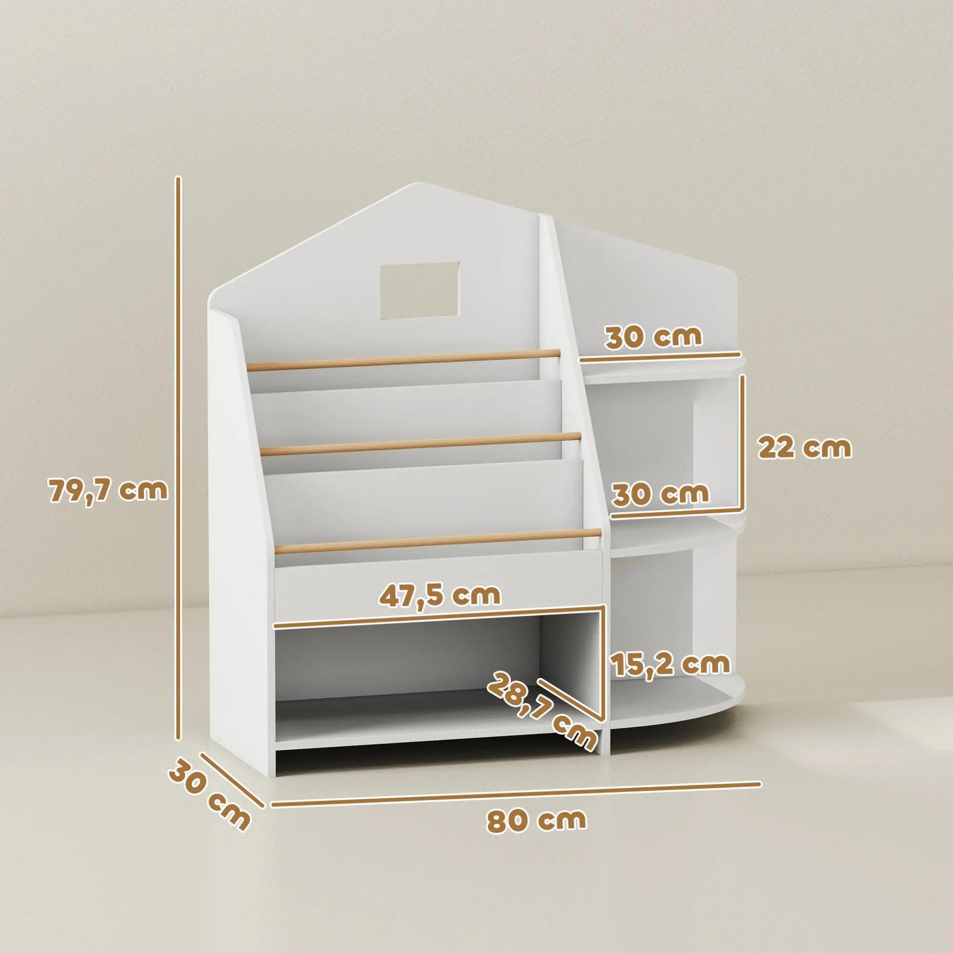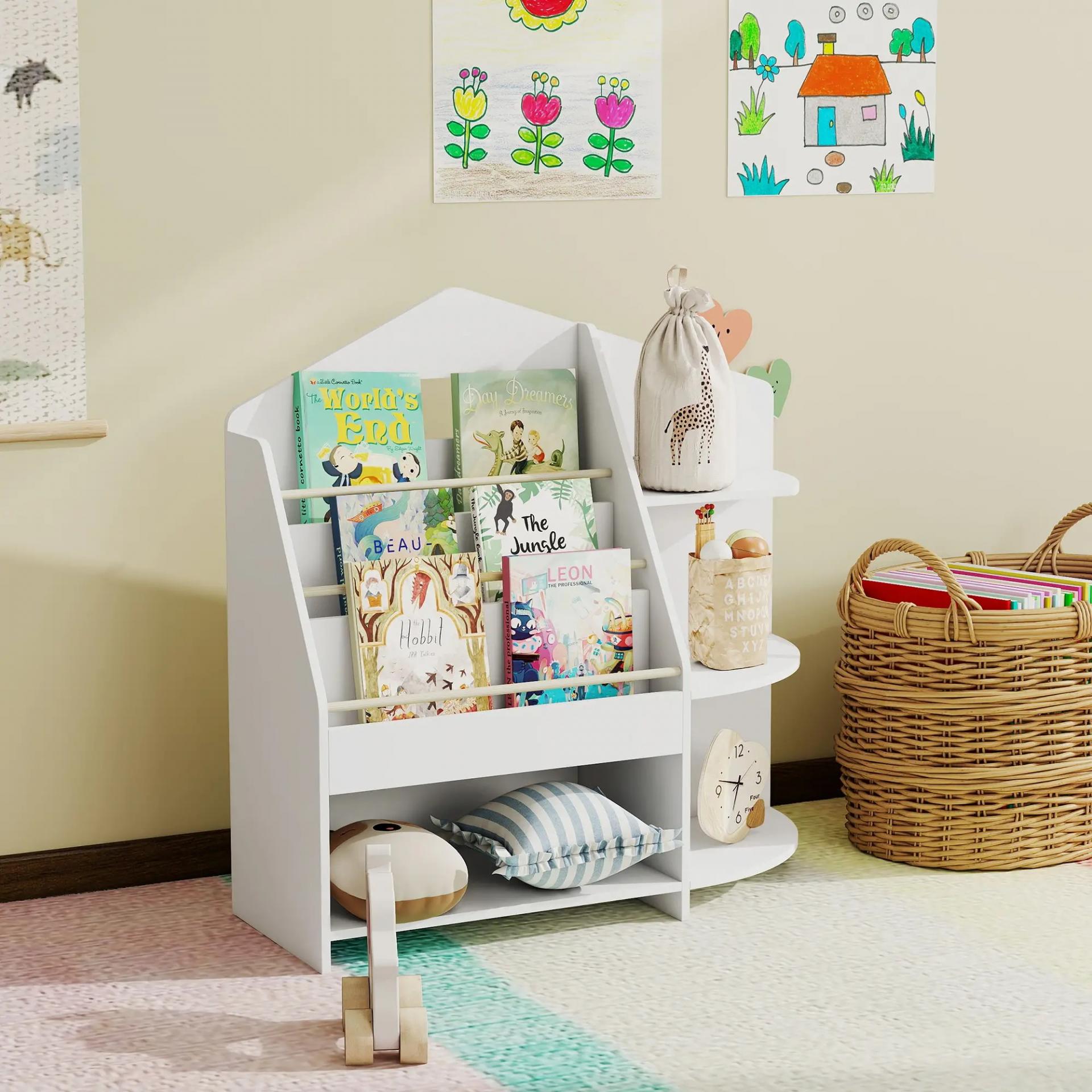 Amplio almacenamiento compartimentado: el estante infantil ofrece cuatro niveles en el lado izquierdo para libros y juguetes y tres compartimentos abiertos a la derecha para libros grandes y material de manualidades, manteniendo el espacio del niño ordenado y estructurado.