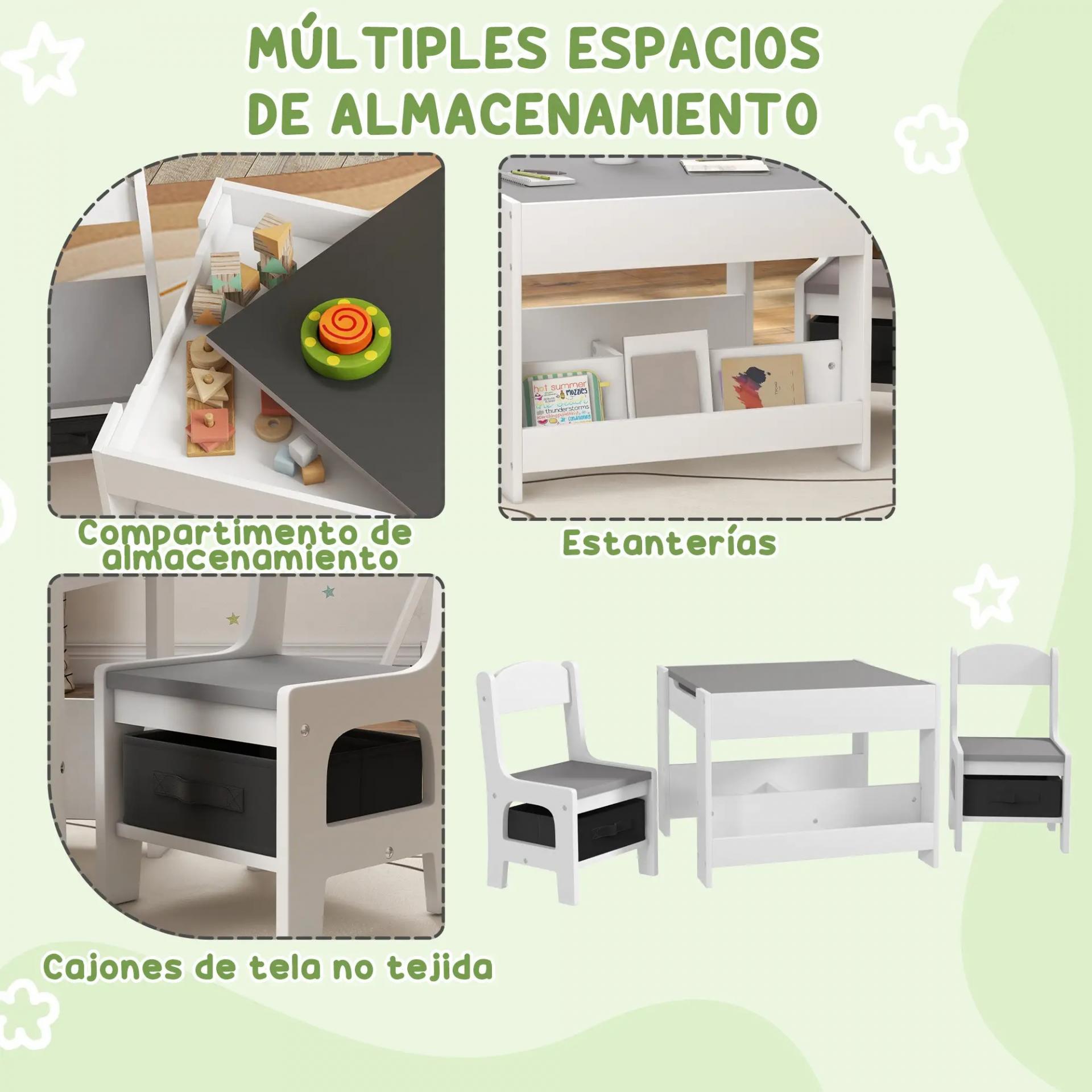 - MESA 3 EN 1: Mesa infantil con encimera reversible, un lado para leer y otro pizarra para dibujar. Además, tras la tapa oculta hay espacio de almacenaje para que los niños guarden sus materiales