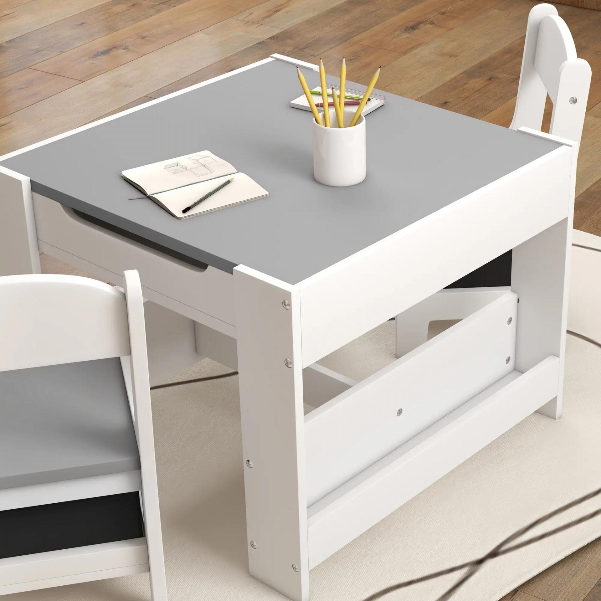 Juego de Mesa con Sillas para Niños 3 en 1 con Pizarra Cajones de Tela y Espacio de Almacenamiento Blanco y Gris