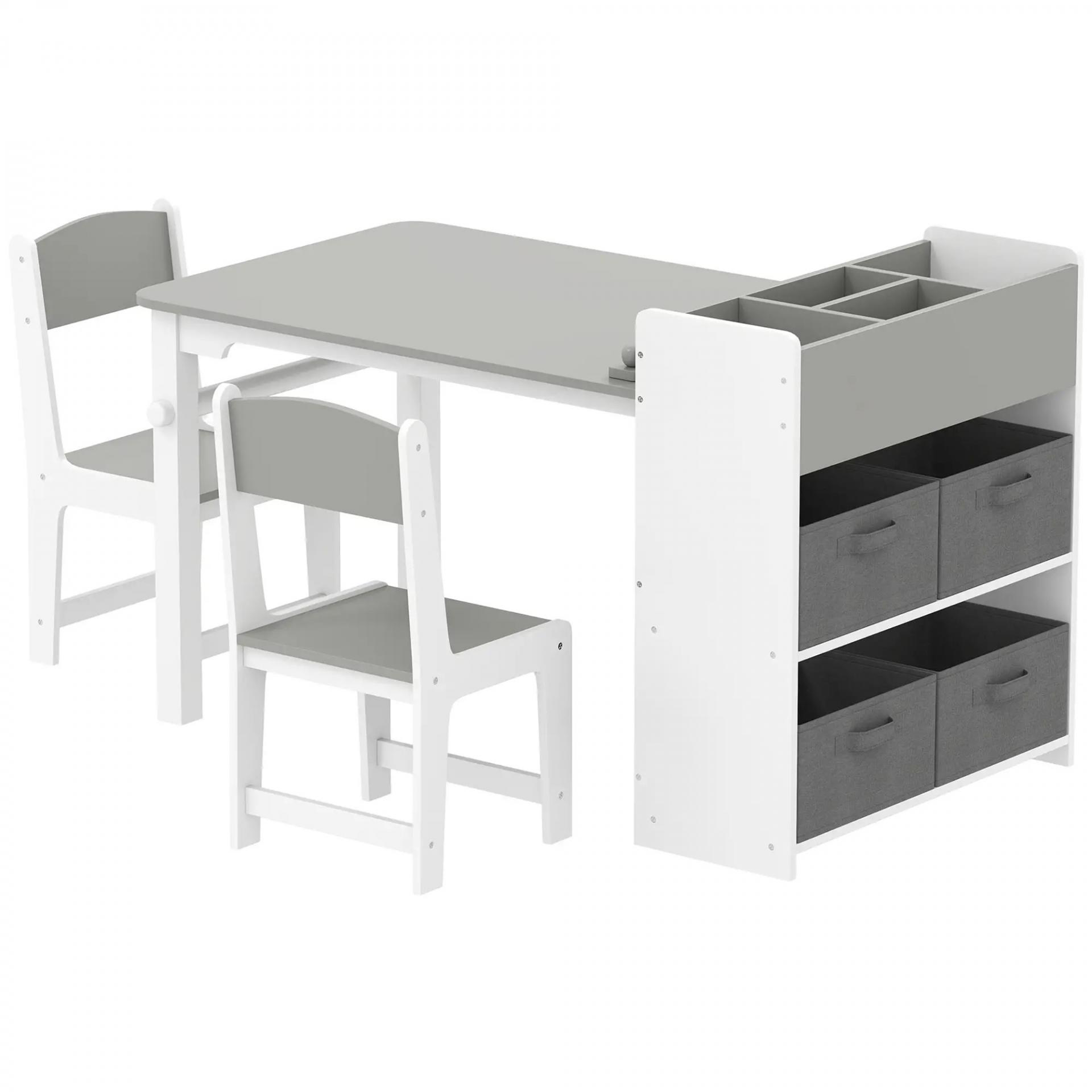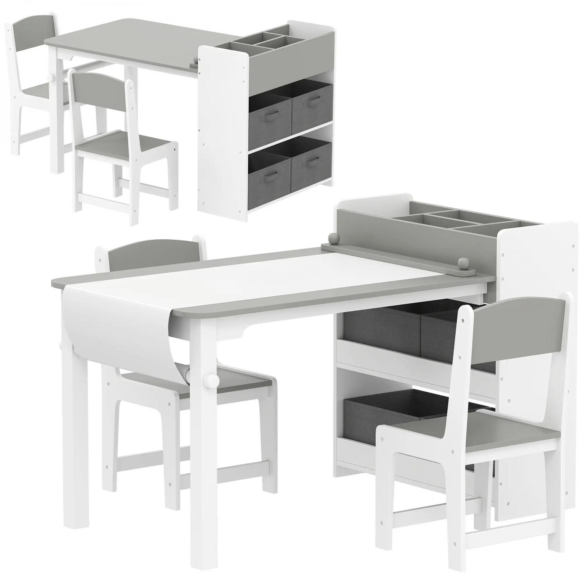 Conjunto mesa y 2 sillas infantil de madera con rollo de papel, estantes y cajones, para niña niño 3-8 años, Gris
