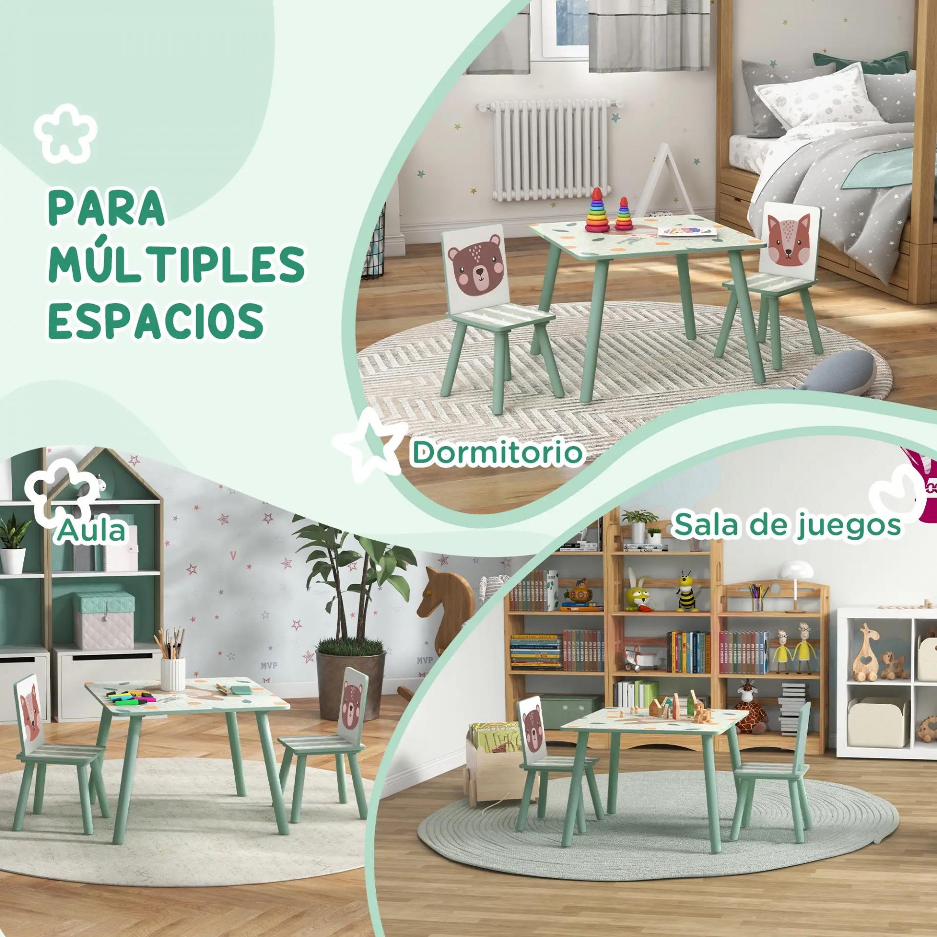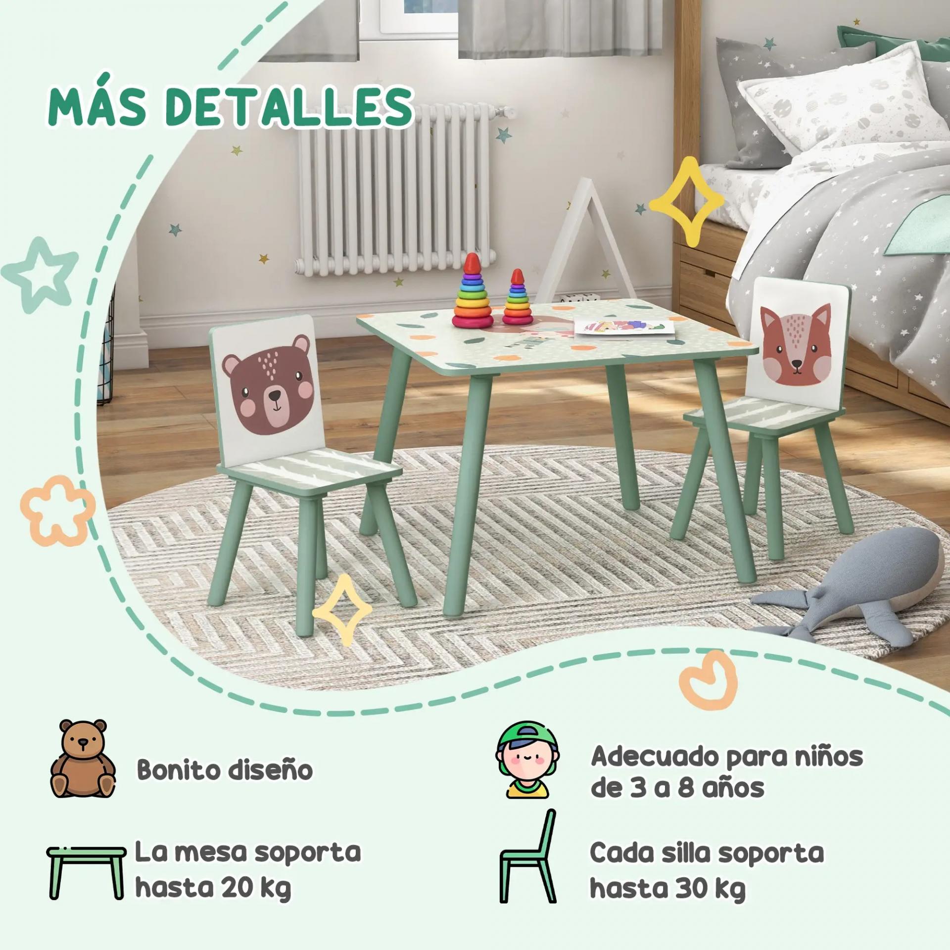 - BONITO DISEÑO CON ESTAMPADO DE ANIMALES: Conjunto con patas de color verte y estampado con cenefas, osos y zorros. Incluye 2 sillas y una mesa. Esta mesa con sillas infantil llamará la atención de los más pequeños a la vez que le dará un toque refinado y bonito a cualquier habitación infantil, sala de juego, ludoteca, etc.