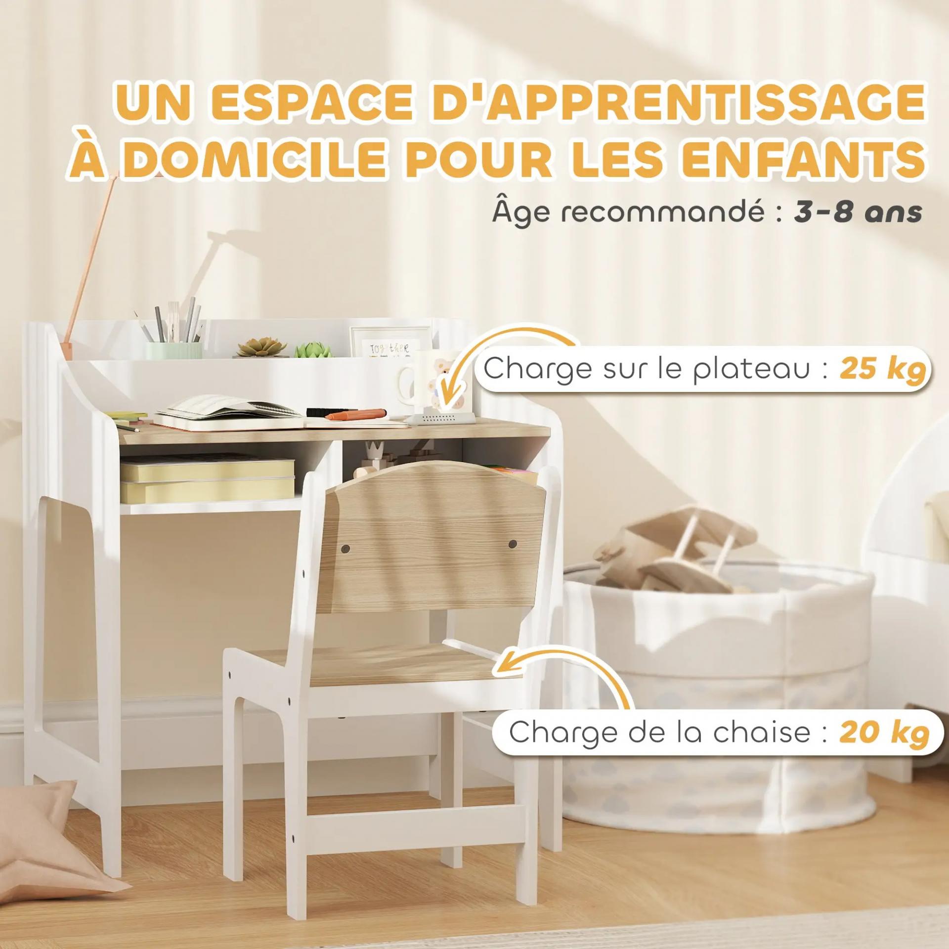 Conjunto de mesa y silla para niños de 3 a 8 años con compartimentos y estantes abiertos, efecto madera natural