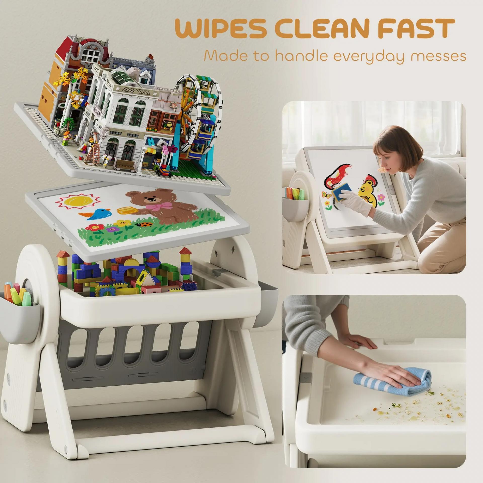 CREA, JUEGA Y APRENDE: Un lado de la mesa multi-juegos está diseñado para jugar con construcciones, el otro para dibujar o leer. Simplemente gira la mesa para alternar momentos de juego y estudio, según los momentos del día