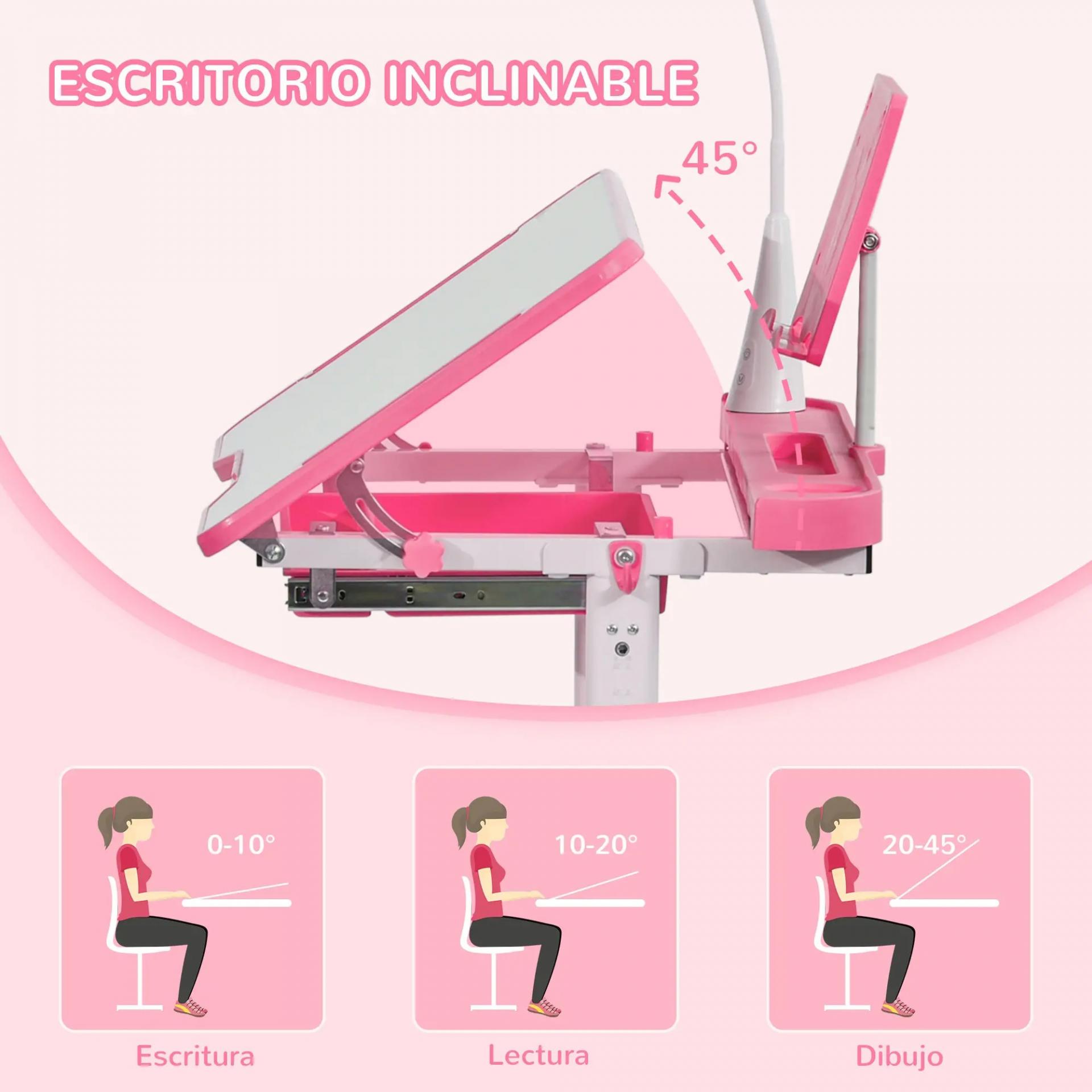 Escritorio y Silla para +6 Años con Altura Ajustable e Inclinable 80x49,5x82-104 cm y 35,5x43,5x63-73 cm Rosa