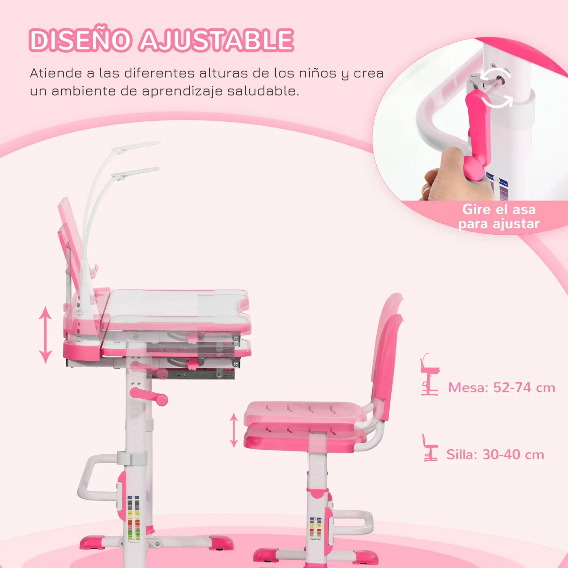 AJUSTABLE: Este escritorio infantil con silla permite regular la altura para crecer junto a tu hijo. Las guías en las patas facilitan la referencia y el tablero se inclina hasta 45°, fomentando una postura correcta y saludable