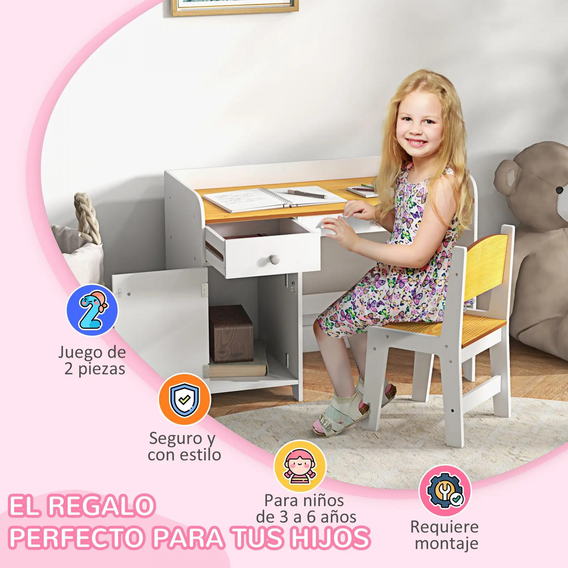 Escritorio para Niños con Silla Conjunto de Escritorio de 2 Piezas con Cajón y Armario Blanco y Natural