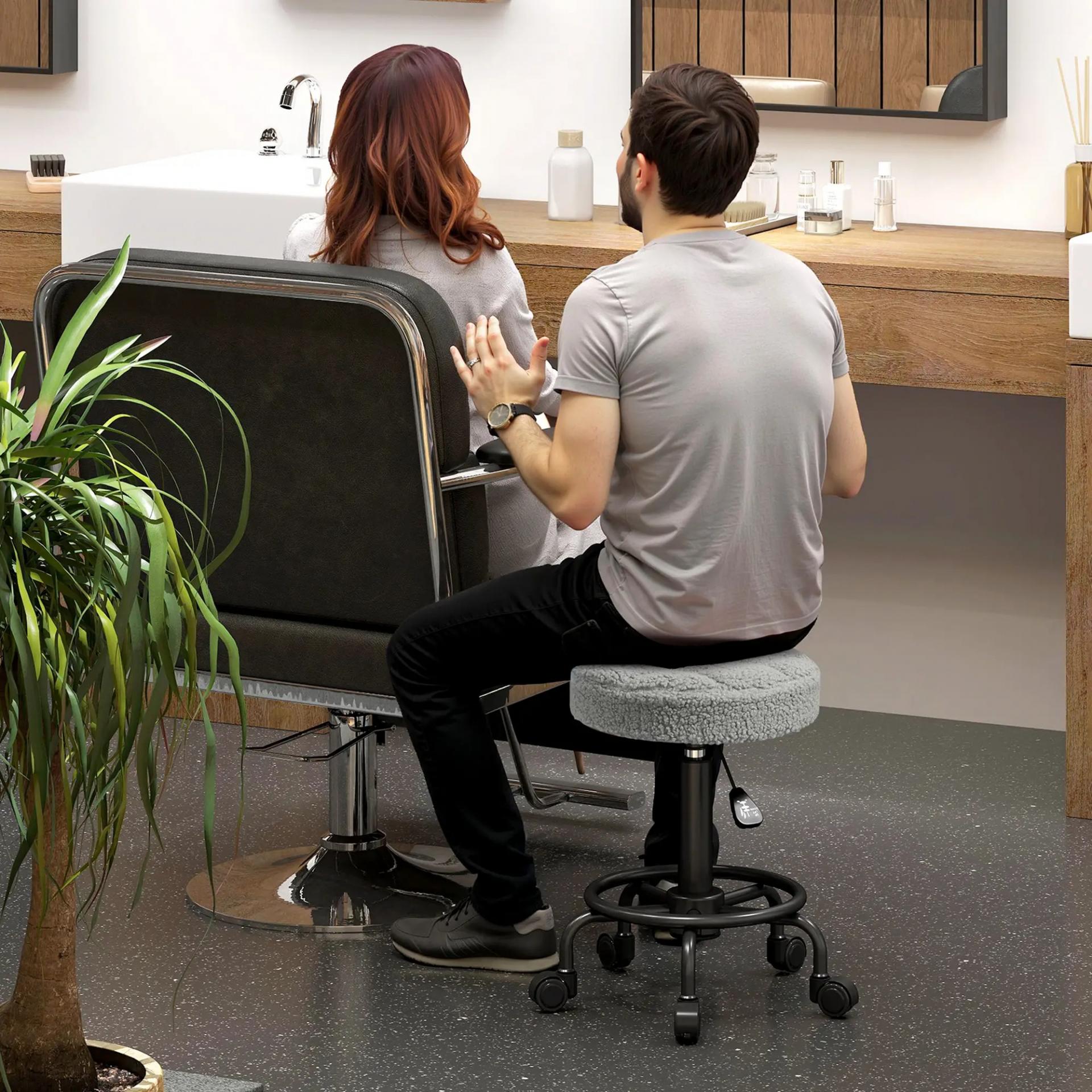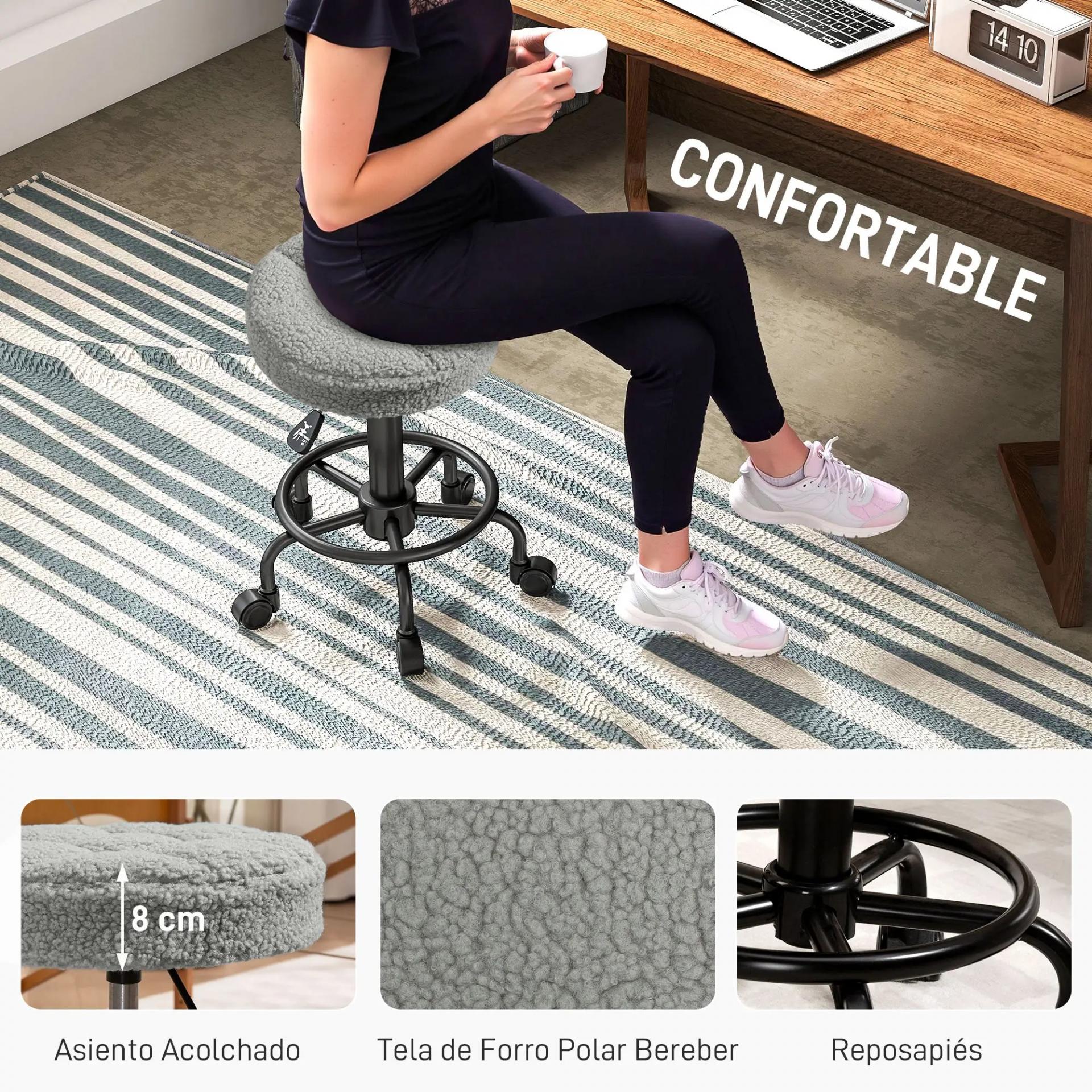 CÓMODO: Este taburete con ruedas tiene un asiento acolchado con espuma de alta densidad y tapizado en borreguito gris, suave y agradable al tacto. Ideal para largas sesiones de trabajo sin perder comodidad ni deformarse