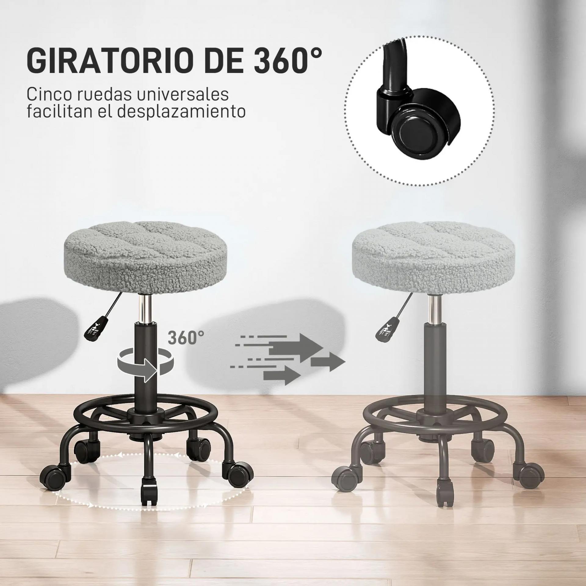 Taburete Giratorio Redondo Taburete con Ruedas Altura Regulable 50-66 cm Asiento Tapizado en Tejido de Borreguito Gris