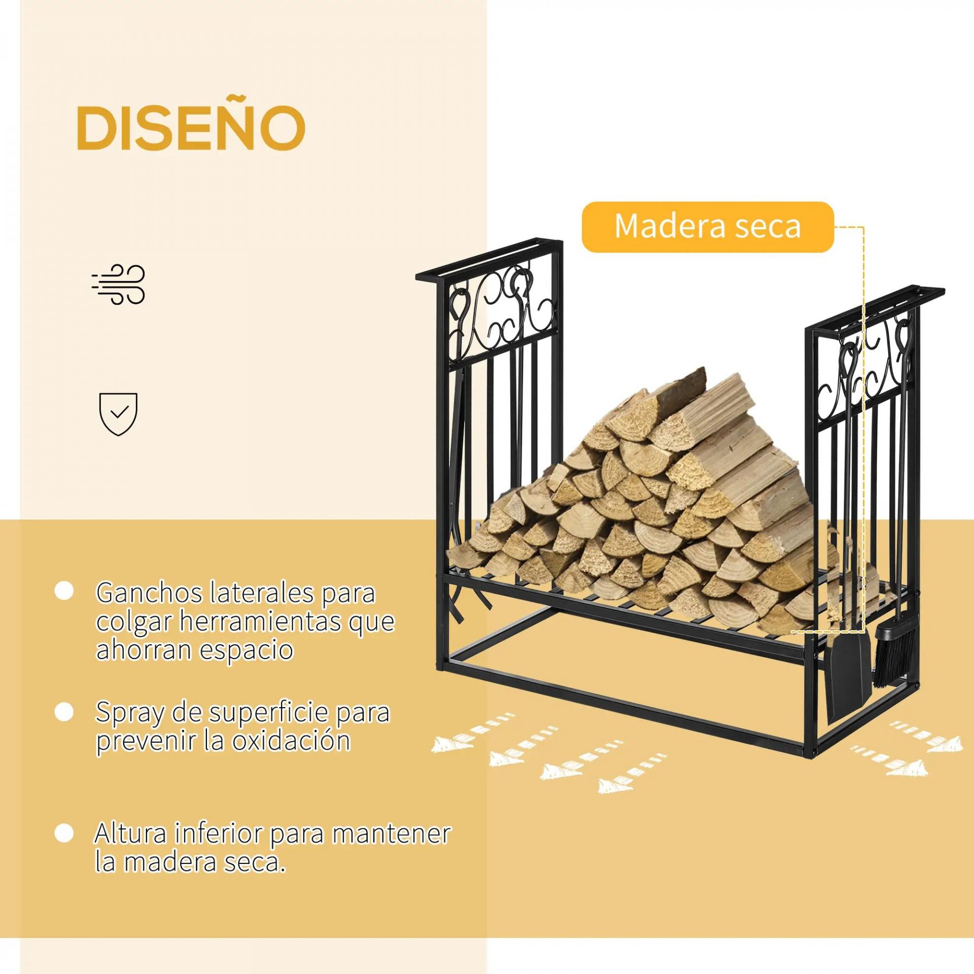 - HERRAMIENTAS INCLUIDAS: Incluye una pala, un cepillo, un atizador de fuego y unas tenazas. El soporte de leña tiene 4 ganchos laterales para que puedas colgar tus herramientas y tenerlas siempre a mano