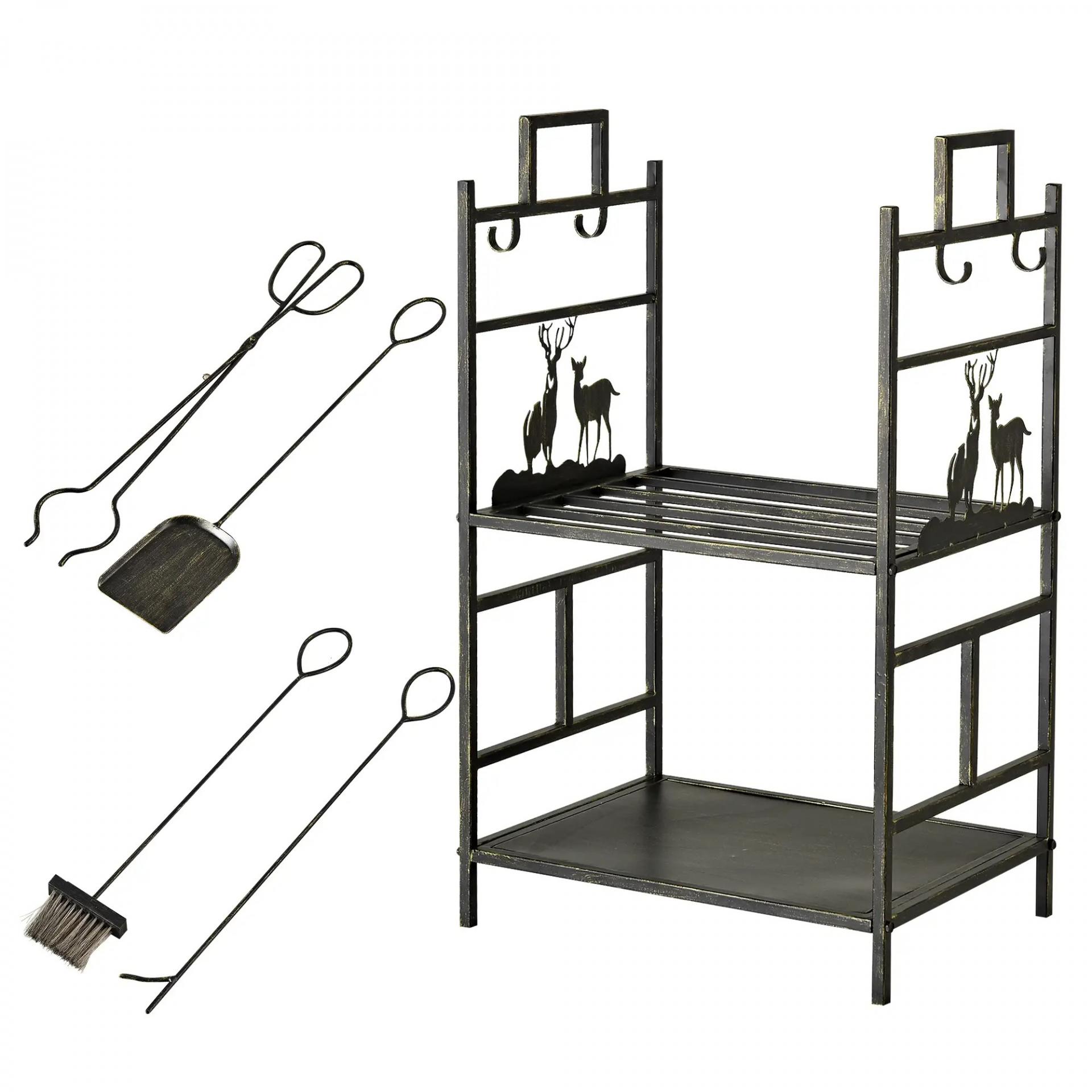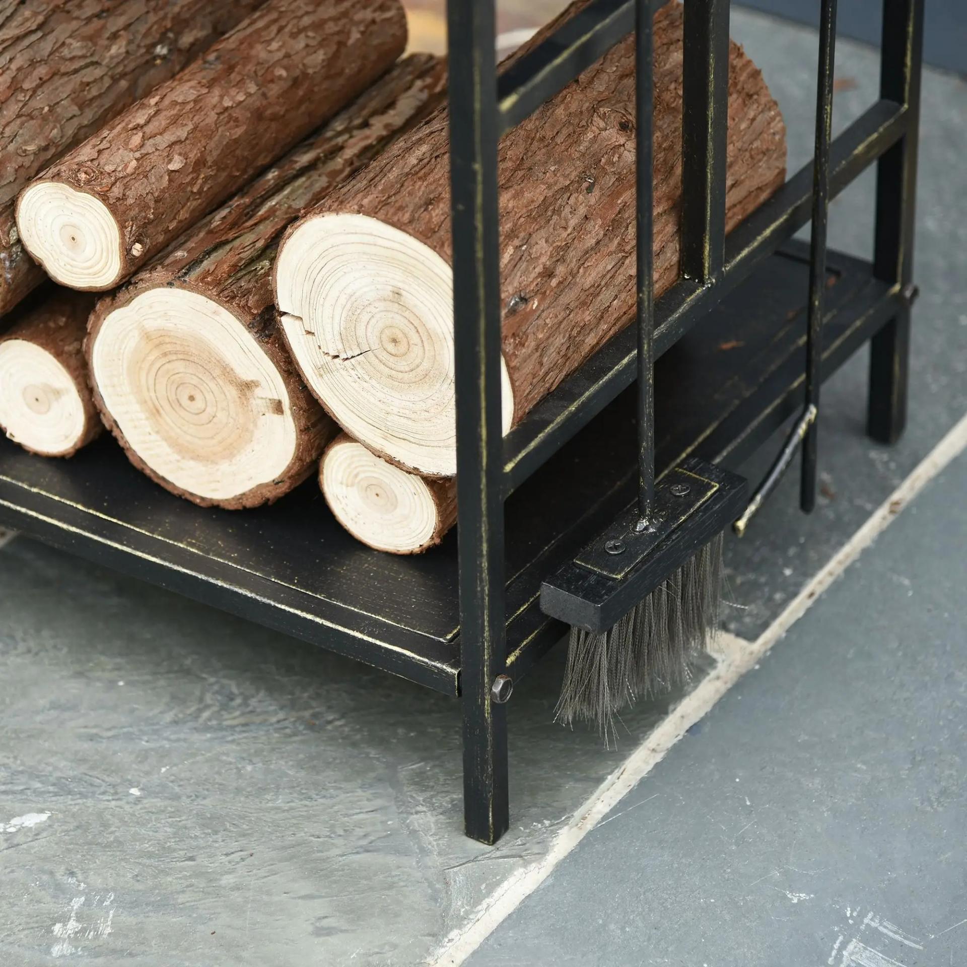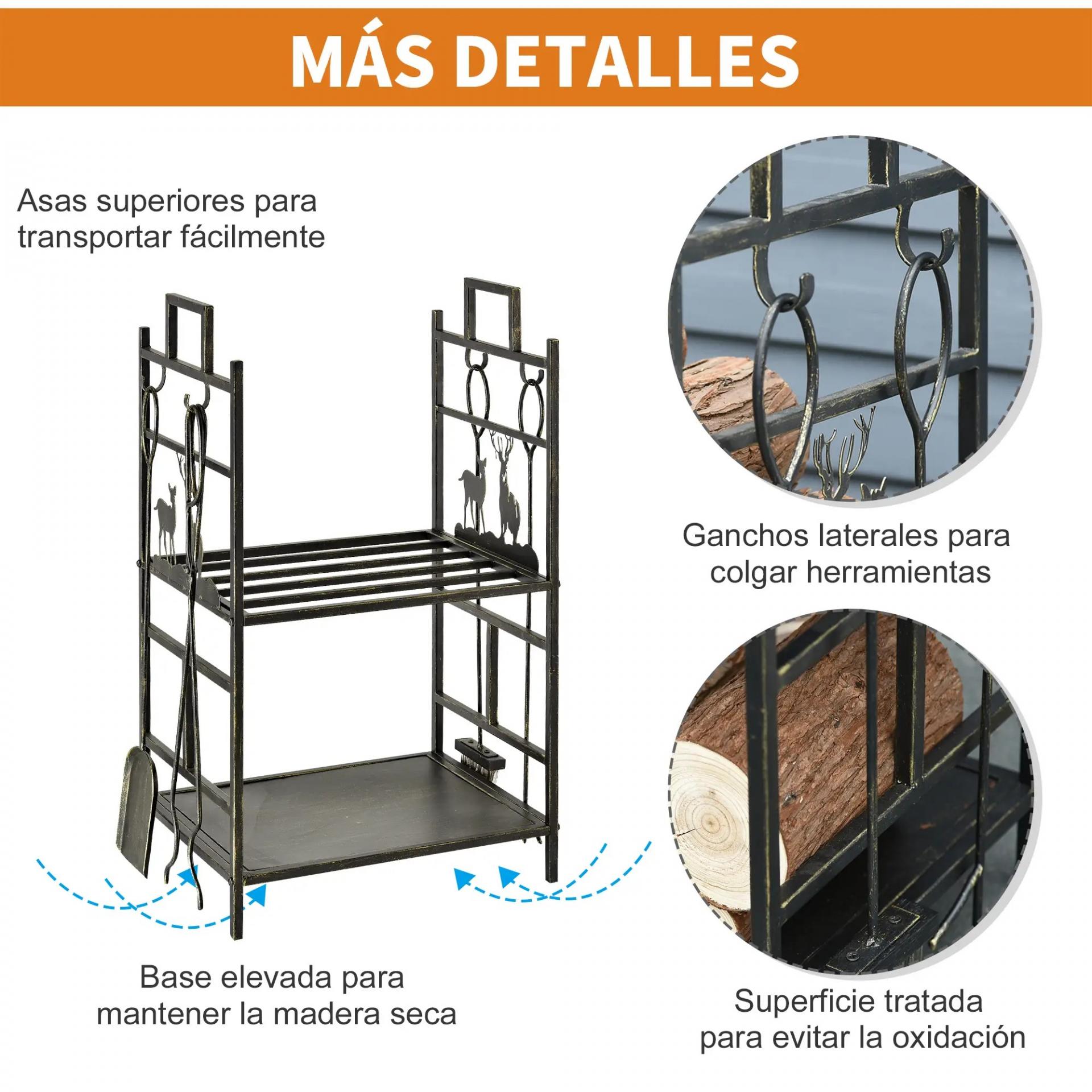 Soporte para Leña de Metal con 4 Herramientas y Asas para Interior y Exterior 51,5x33x77 cm Negro Dorado