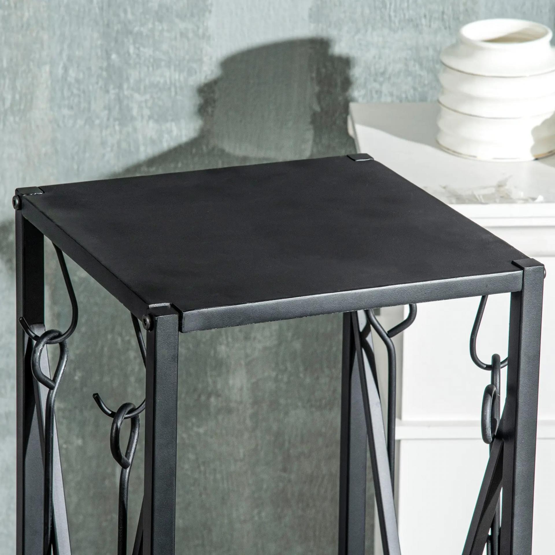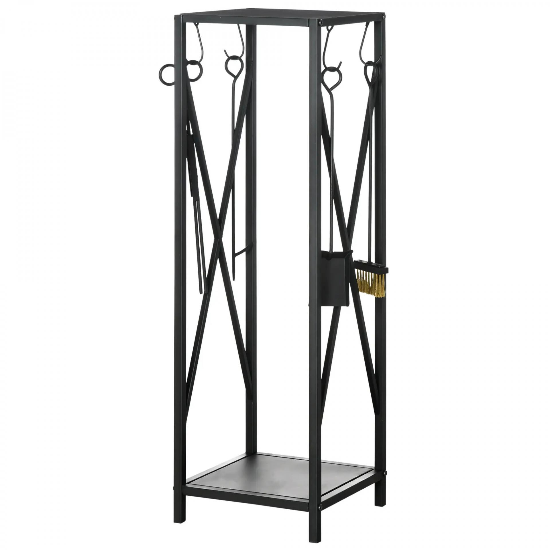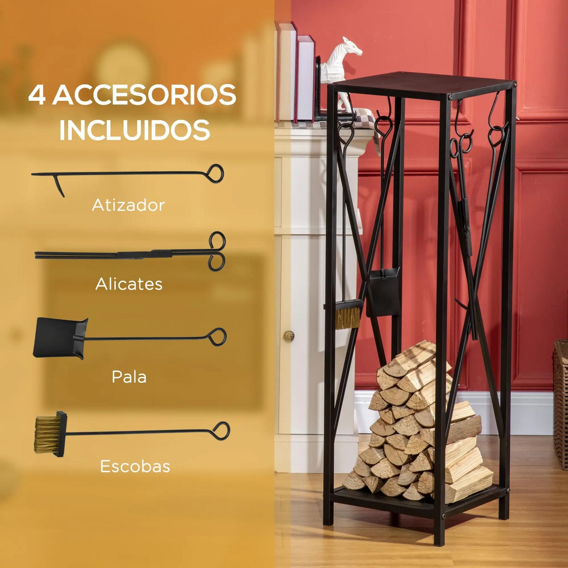 Estante de Leña Metálico Leñero de Exterior con Ganchos Pala Cepillo Atizador y Tenazas Carga 65 kg 34x34x111 cm Negro