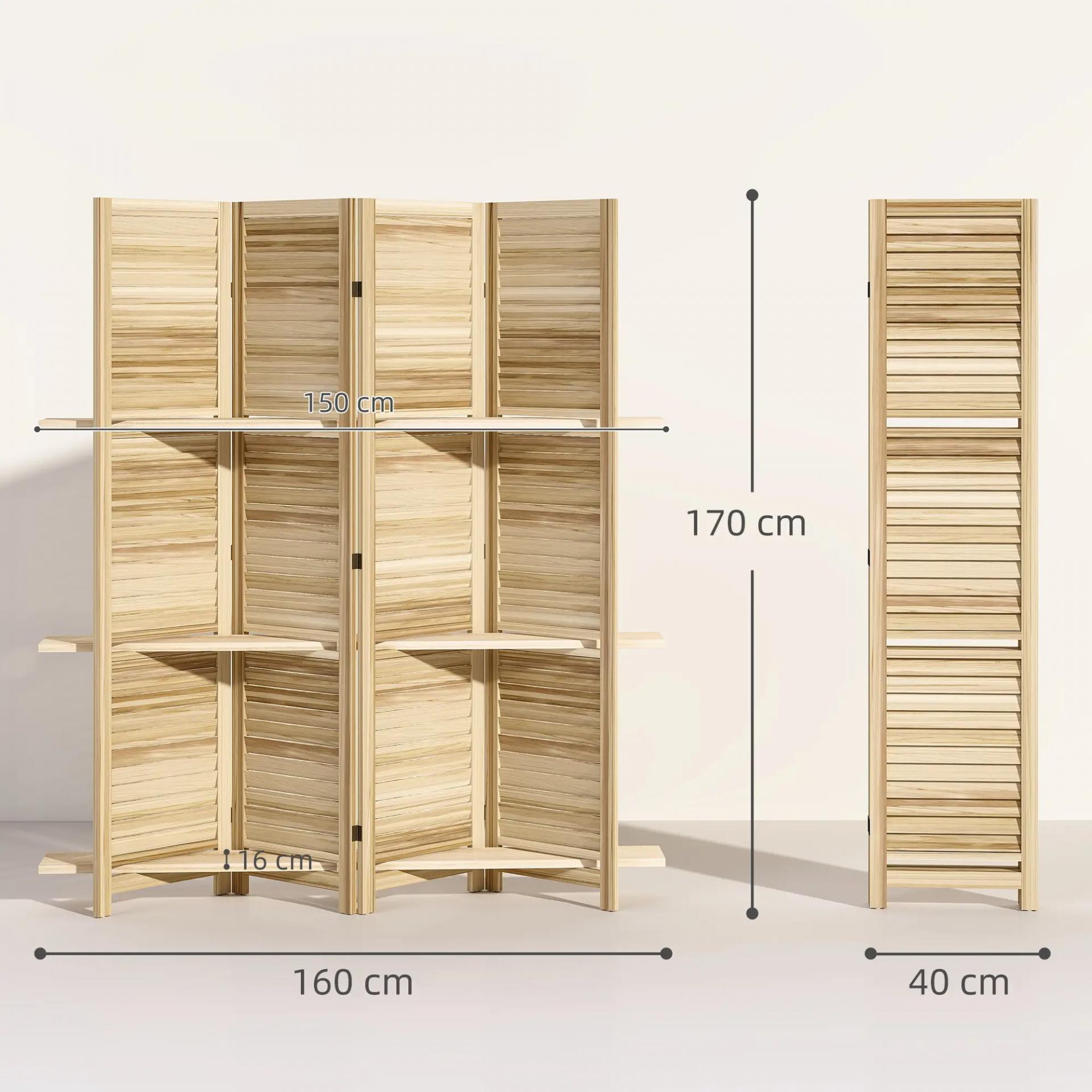Biombo interior de madera 4 paneles 160 x 170 cm, separador de ambientes plegable con 3 estantes, madera natural