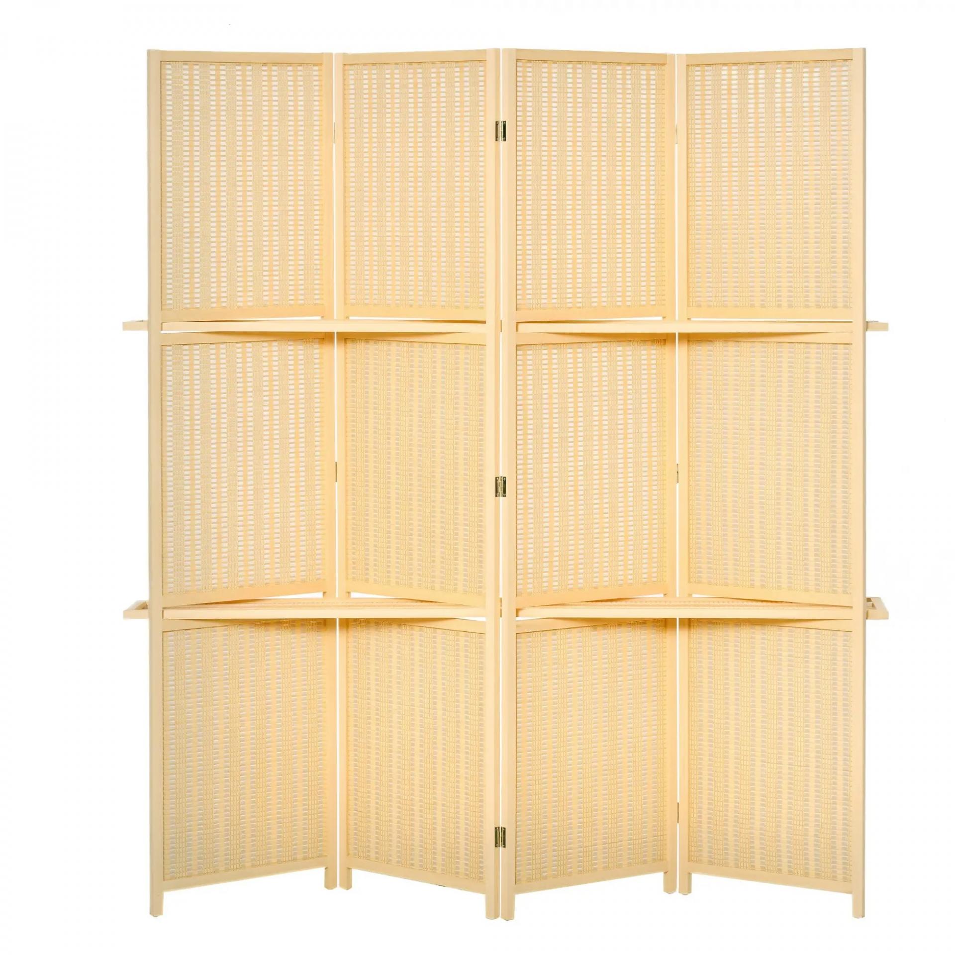 Biombo Separador de Ambientes Plegable de 4 Paneles con 2 Estantes Extraíbles para Dormitorio 180x180 cm Natural