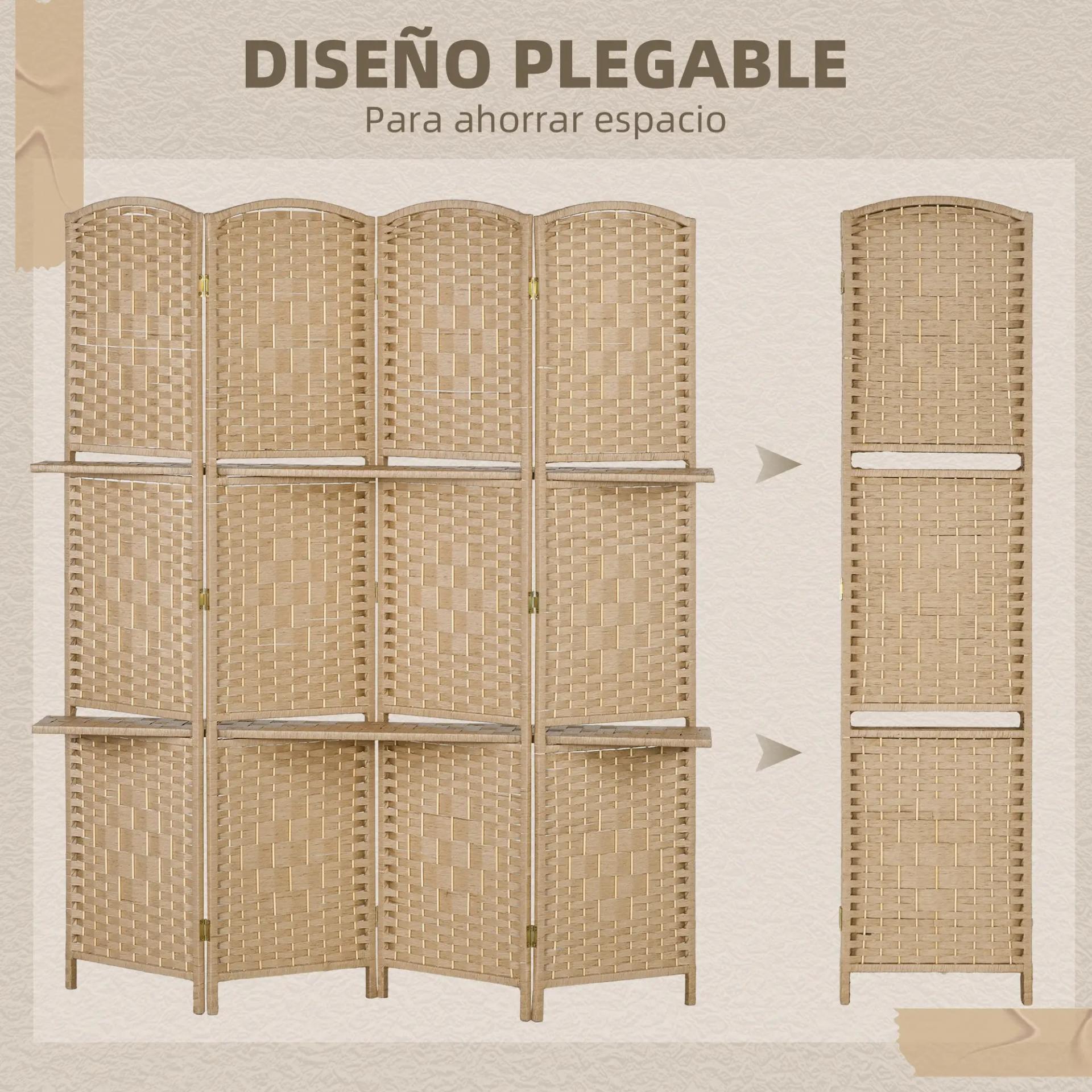Biombo Separador de Ambientes 4 Paneles 160x170 cm con 2 Estantes de Exhibición Pantalla de Privacidad Plegable Natural