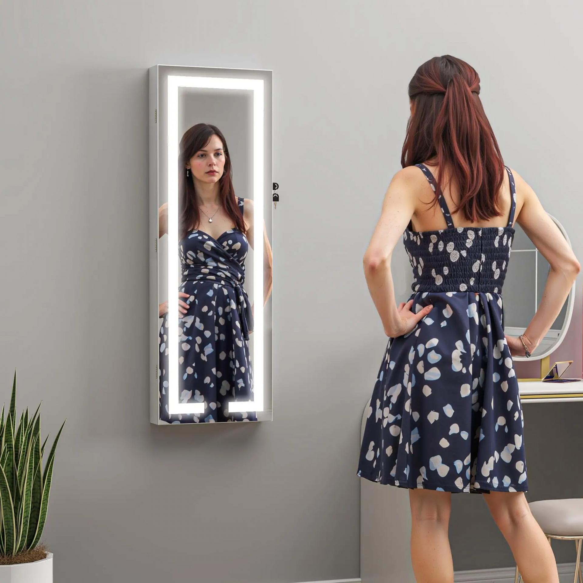 Espejo Joyero de Pared con Luces LED y Cerradura Armario de Joyas para Colgar en la Pared o en la Puerta Blanco