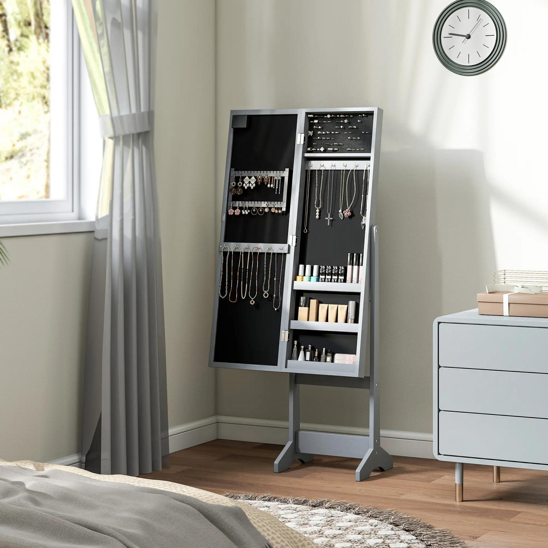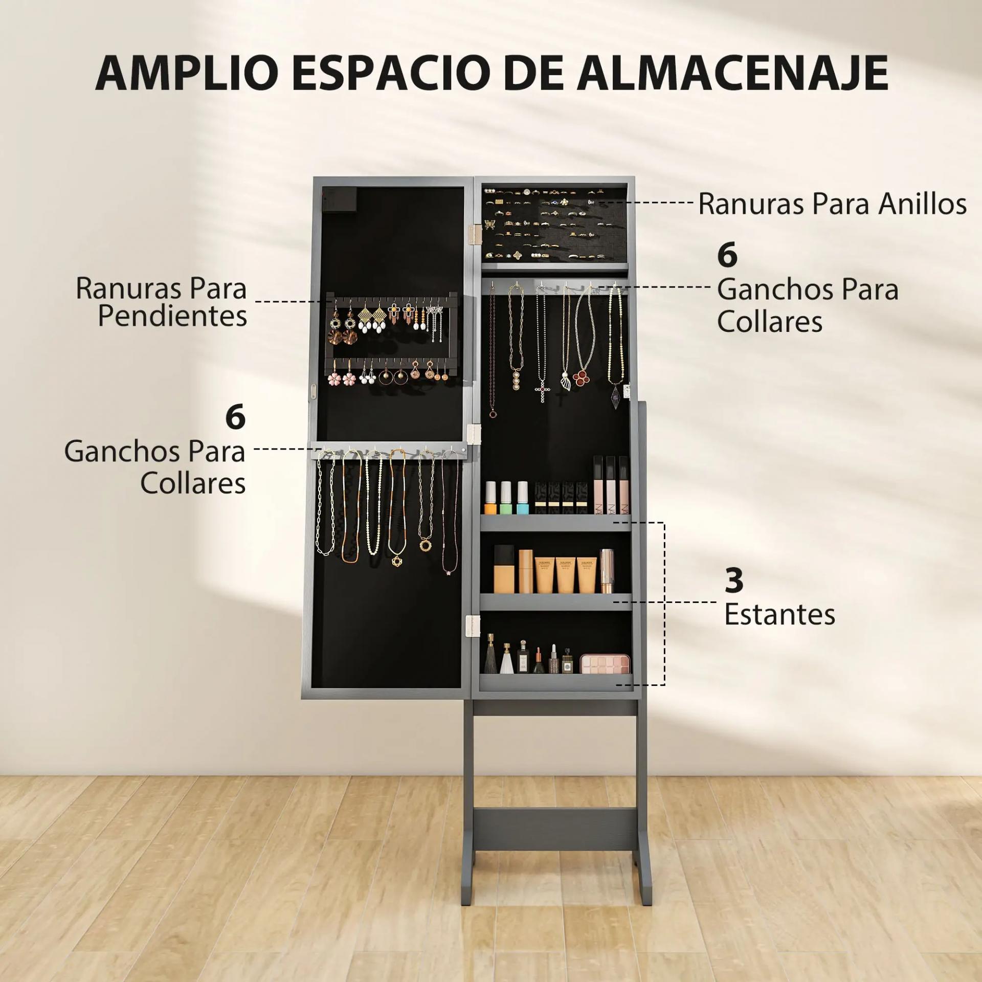 - JOYERO DE PIE CON ESPEJO: Este armario joyero con espejo de cuerpo entero de HOMCOM es ideal para organizar joyas, cosméticos y más. El espejo exterior se ajusta en 3 ángulos distintos para elegir siempre la perspectiva más adecuada en cada momento
