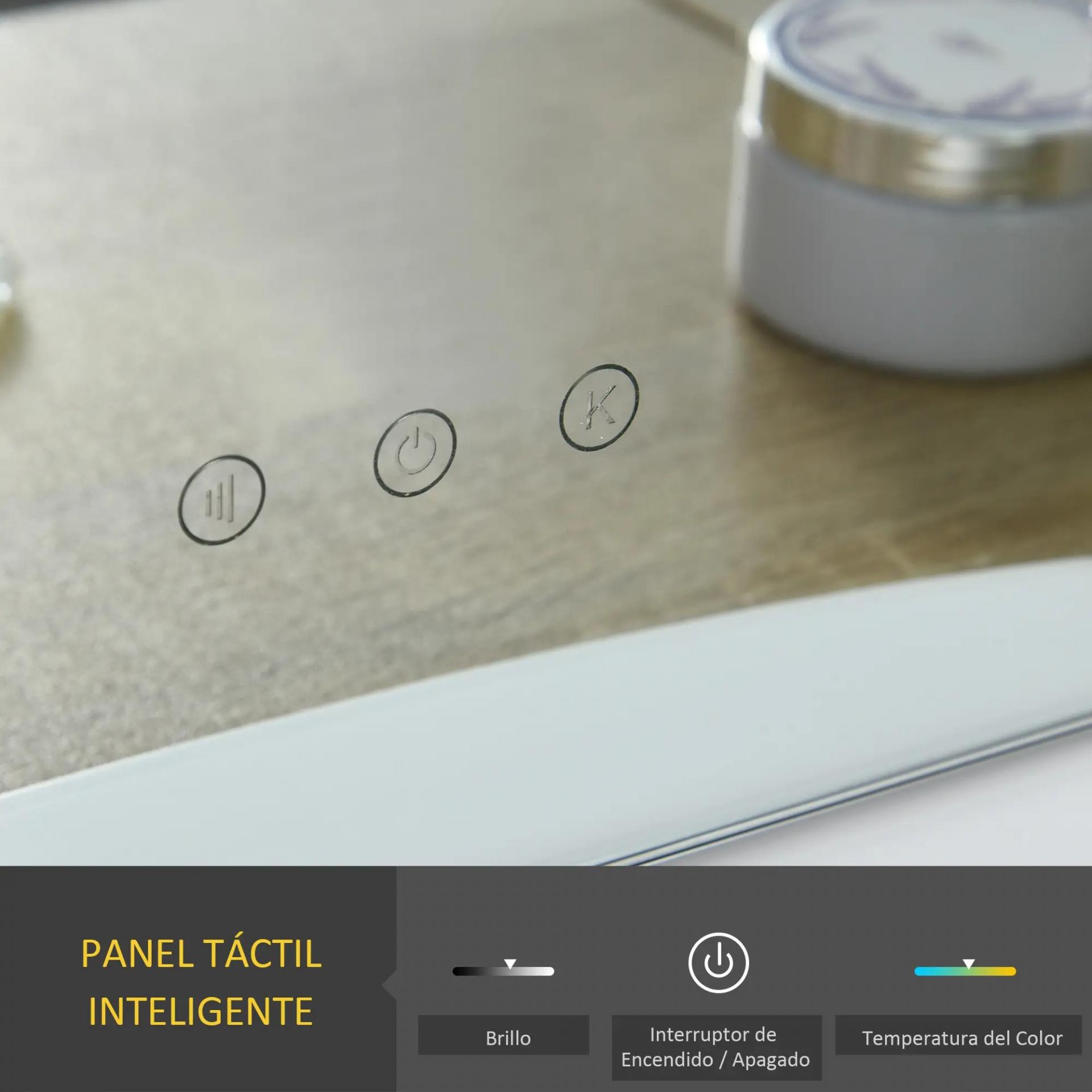 - PANTALLA TÁCTIL: Este espejo lleva dibujados unos iconos que en realidad son botones táctiles, bonitos y prácticos. El central es para encender y apagar, el izquierdo sirve para ajustar el brillo y con el derecho puedes cambiar la temperatura del color