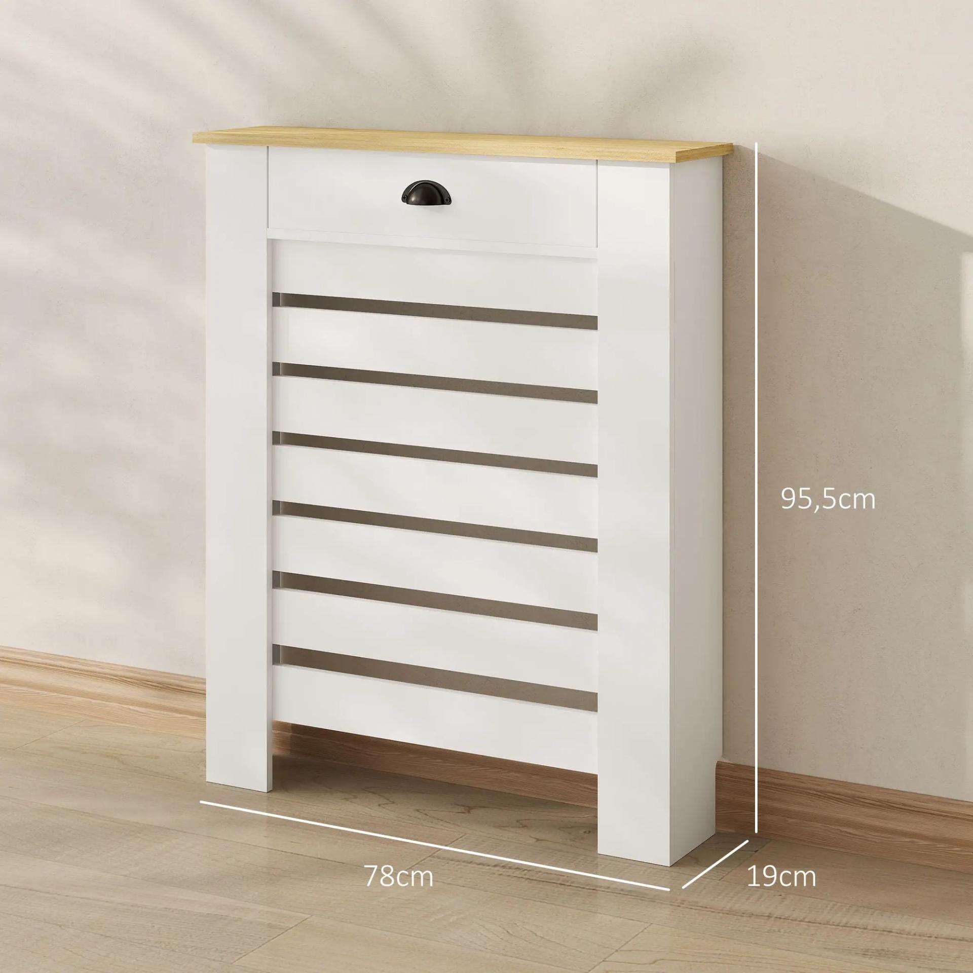 - ALMACENAMIENTO ADICIONAL: Esta cubierta alta para radiador cuenta con un práctico cajón para guardar objetos esenciales, mientras que su superficie superior plana permite colocar fotos, adornos u otros elementos decorativos fácilmente