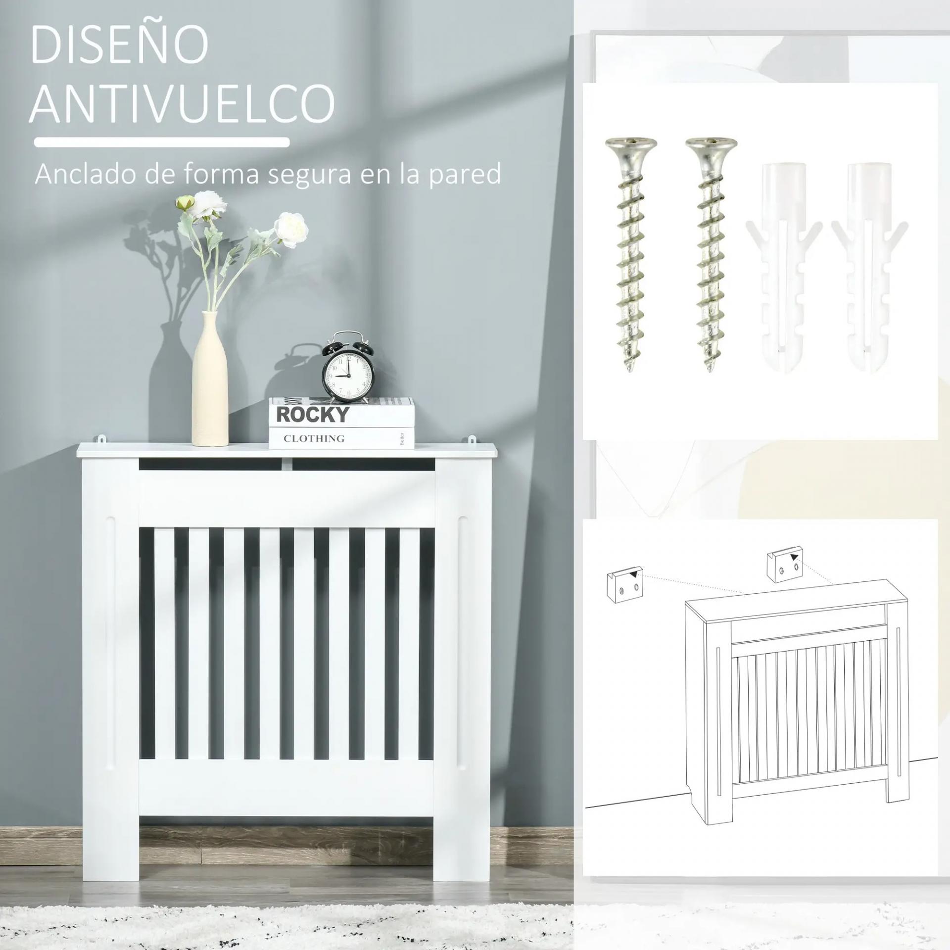 - DISPOSITIVO ANTIVUELCO: Este cubre radiadores viene con un sistema de fijación antivuelco de seguridad para fijarlo a la pared y evitar así que pueda volcarse o tambalearse