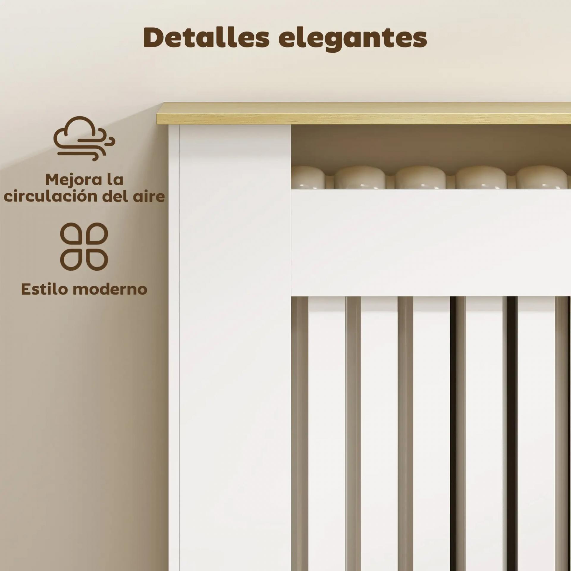- MODERNA Y FUNCIONAL: Este cubre radiadores presenta un diseño moderno en lamas con tiradores plateados elegantes. La tapa con efecto madera natural permite la circulación eficiente del calor, garantizando un ambiente bonito y acogedor