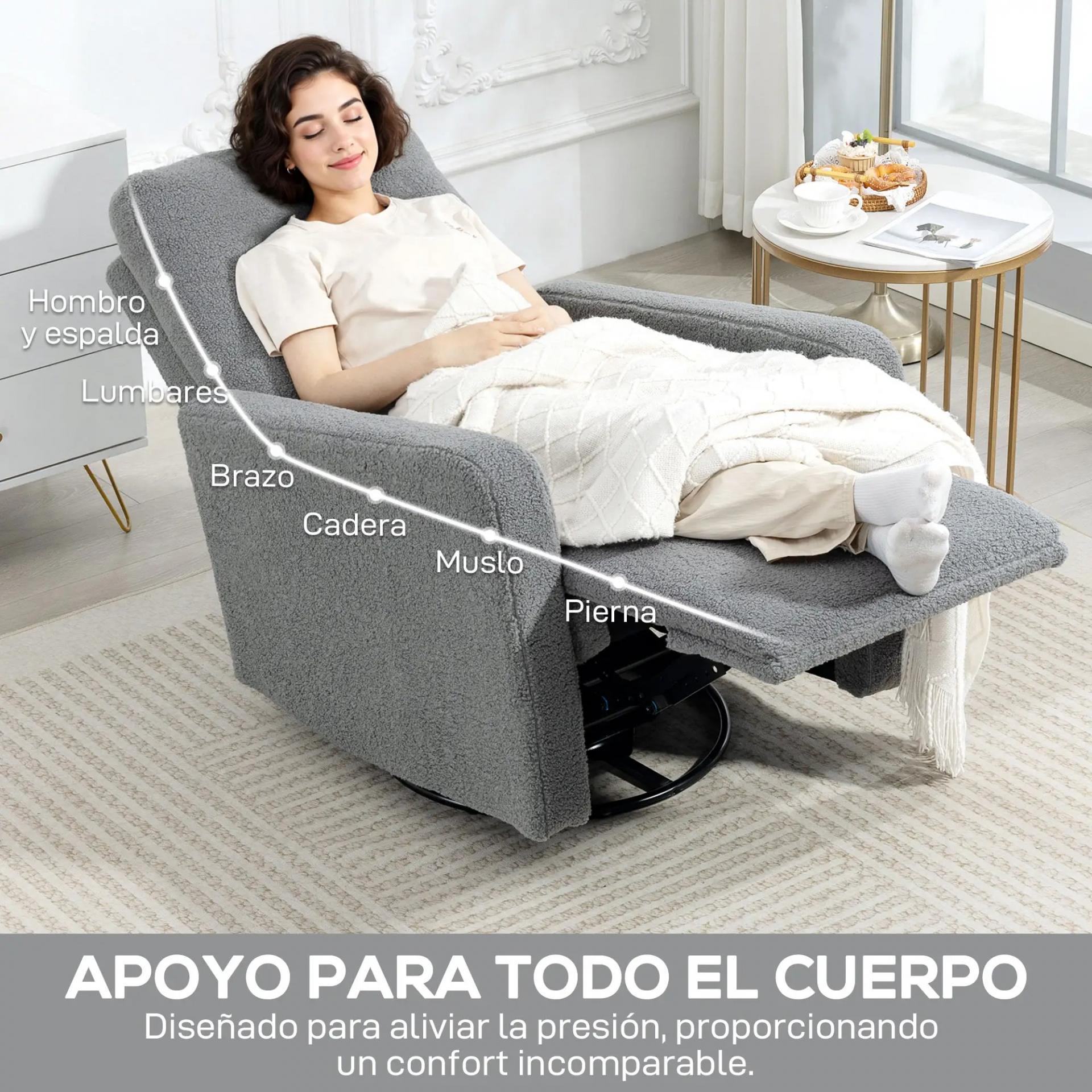 Sillón Relax Reclinable Manual hasta 135º con Reposabrazos Reposapiés Acolchado Grueso y Función de Balanceo 360° Gris